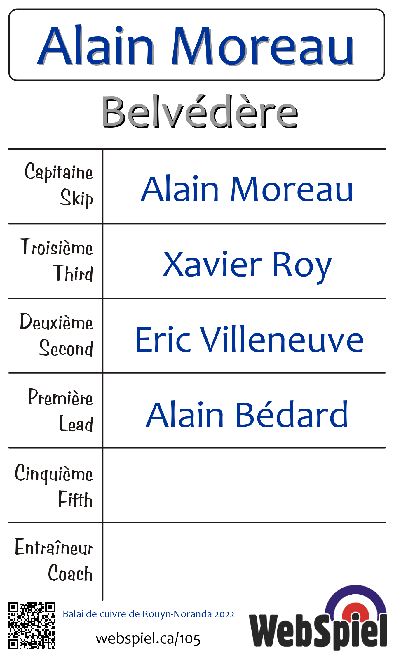 Sunday, March 20th, 2022, at 11:00am EDT Club de curling Noranda, Sheet 5 · E, Winner › C15, Loser › OUT | |||||||||