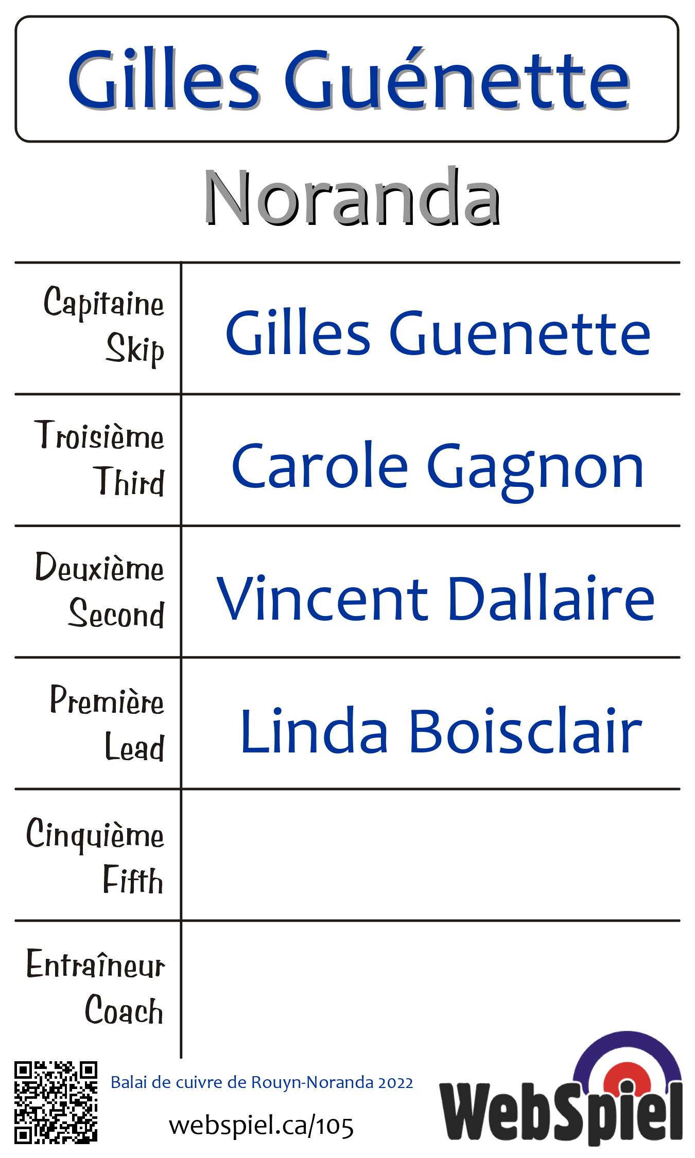 Saturday, March 19th, 2022, at 11:00am EDT Club de curling Noranda, Sheet 6 · F, Winner › C12, Loser › D04 | |||||||||