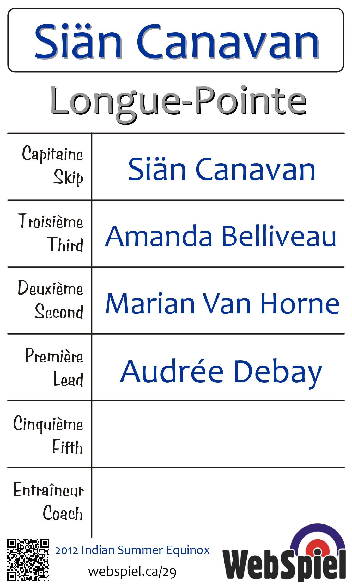 Saturday, October 13th, 2012, at 10:30am EDT Glenmore Curling Club, Sheet 212 | |||||||||