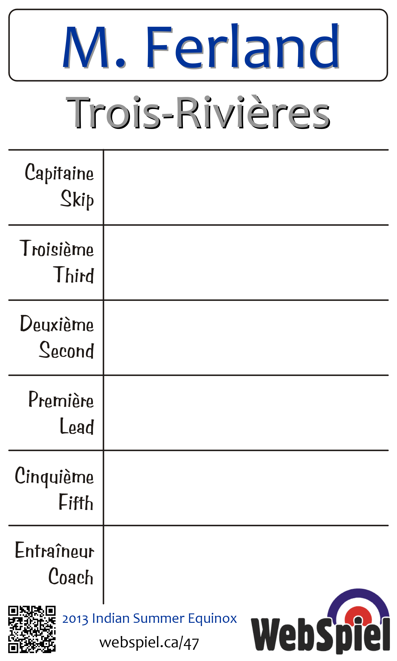 | Club | Trois-Rivières Club de curling Trois-Rivières 630 St-Ursule C.P. 123 Trois-Rivières, QC G9A 1P1 CANADA T: 819-375-1313 F: 819- 375-1313 http://www.curlingtr.com/ |