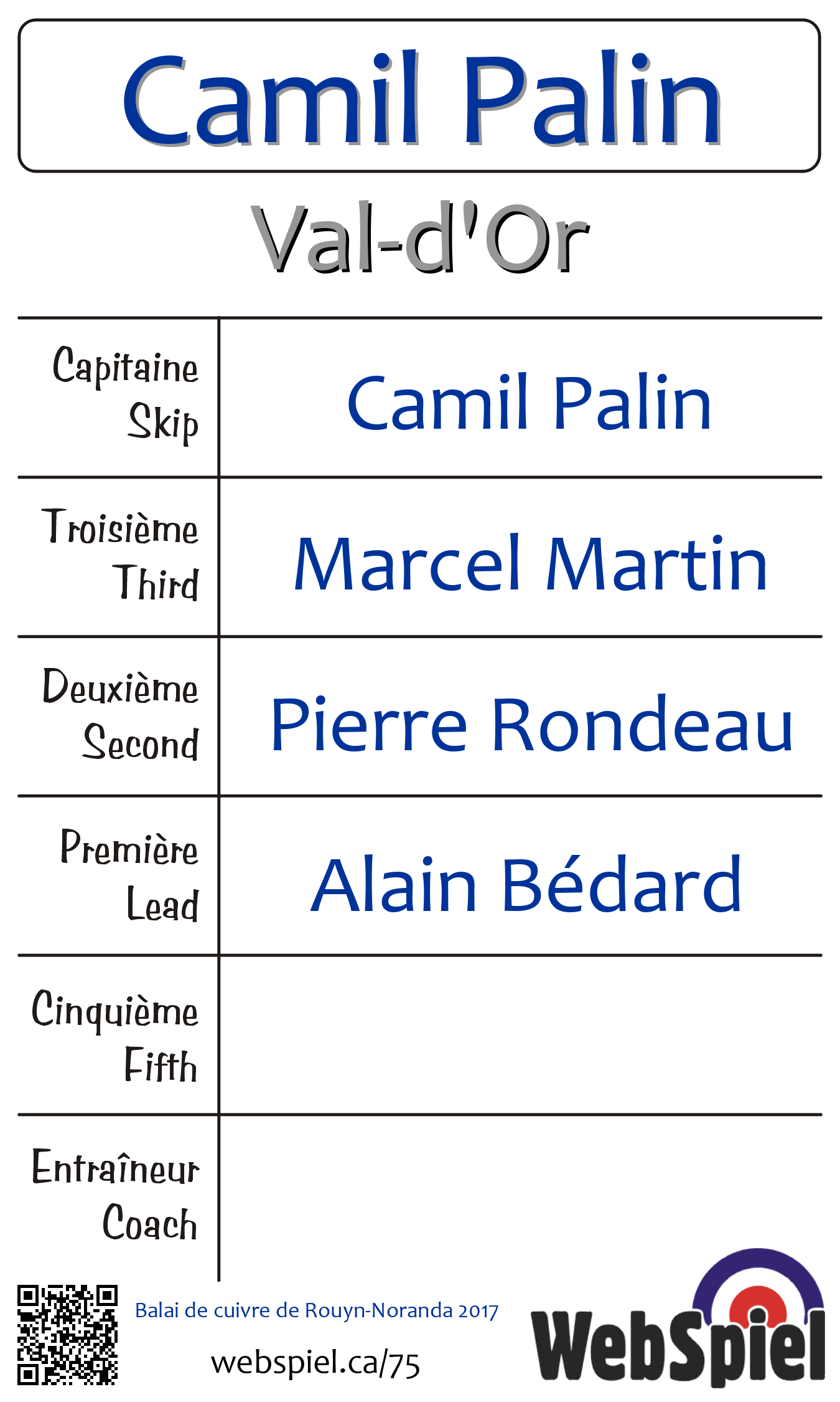Saturday, March 11th, 2017, at 2:00pm EST Club de curling Noranda, Sheet 1 · A, Winner › A60, Loser › B12 | |||||||||