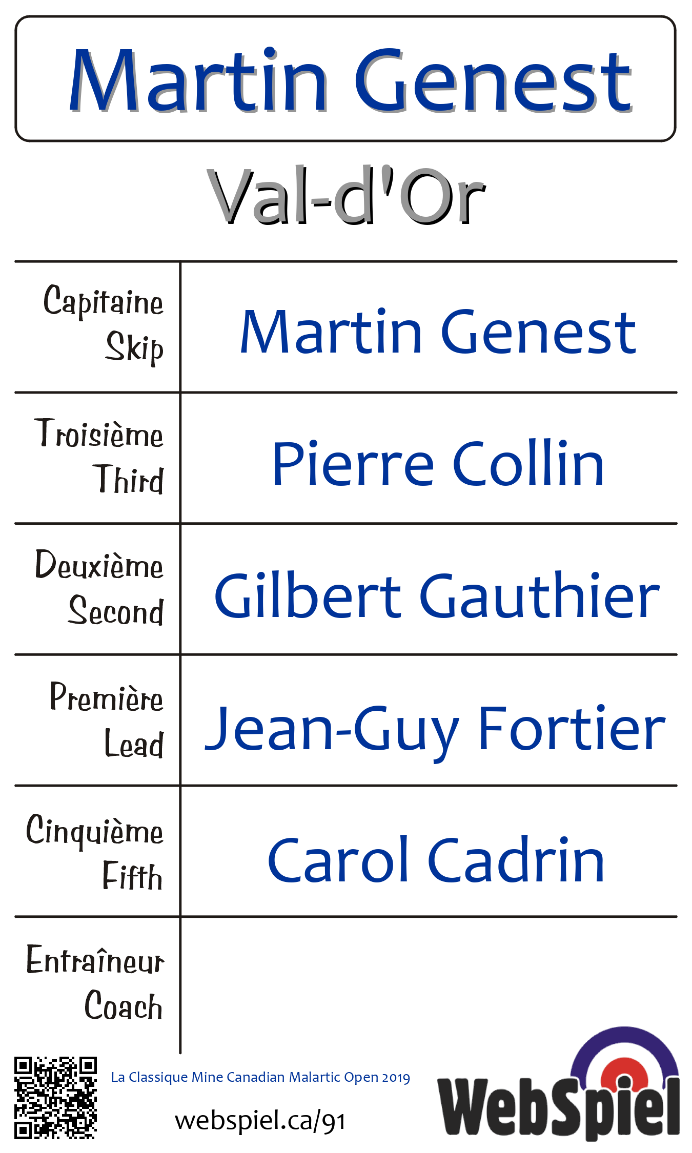 Saturday, February 16th, 2019, at 2:00pm EST Club de curling du Belvédère, Sheet 4 · D, Winner › C16, Loser › OUT | |||||||||