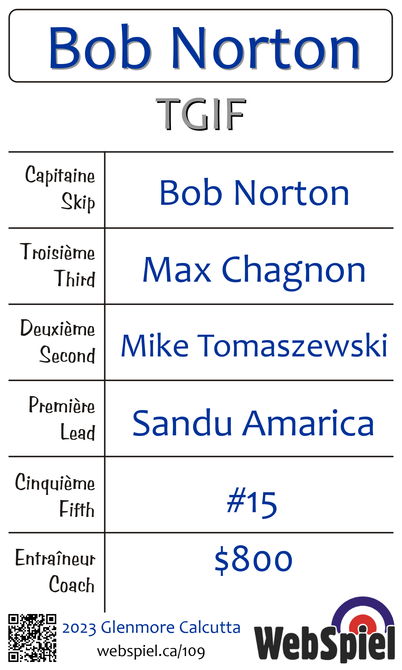 | Club | TGIF Glenmore Curling Club 120 rue Glenmore Dollard-des-Ormeaux, QC H9B 2X9 CANADA T: 514-684-6350 F: 514-684-6352 http://www.glenmorecurling.com 4 glaces |