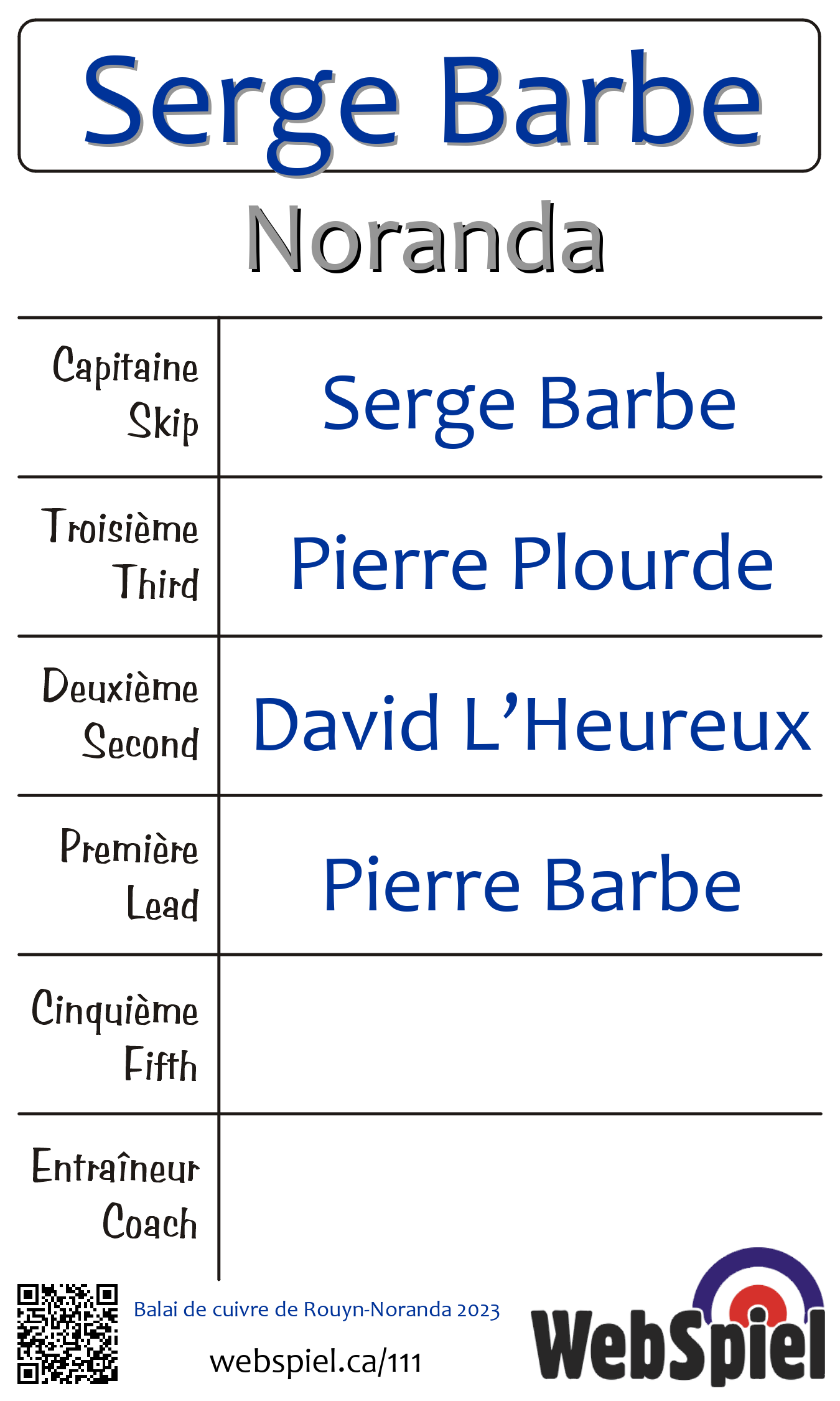 Dimanche le 5 mars 2023, à 11h15 EST Club de curling Noranda, Glace 5 · E, Gagnant › C16, Perdant › Éliminé | |||||||||