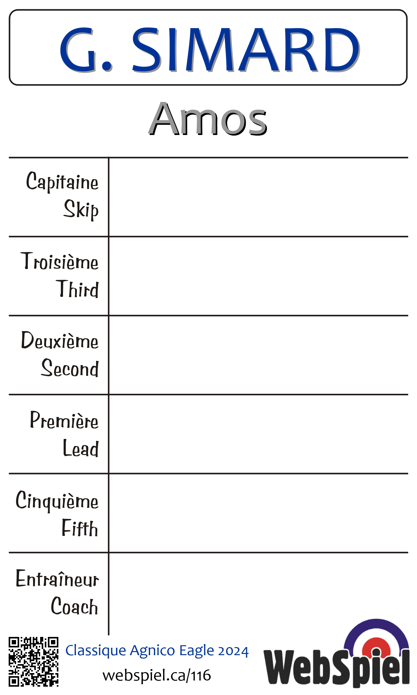 Samedi le 16 mars 2024, à 19h00 EDT Club de curling du Belvédère, Glace 3 · C, Gagnant › C17, Perdant › Éliminé | |||||||||