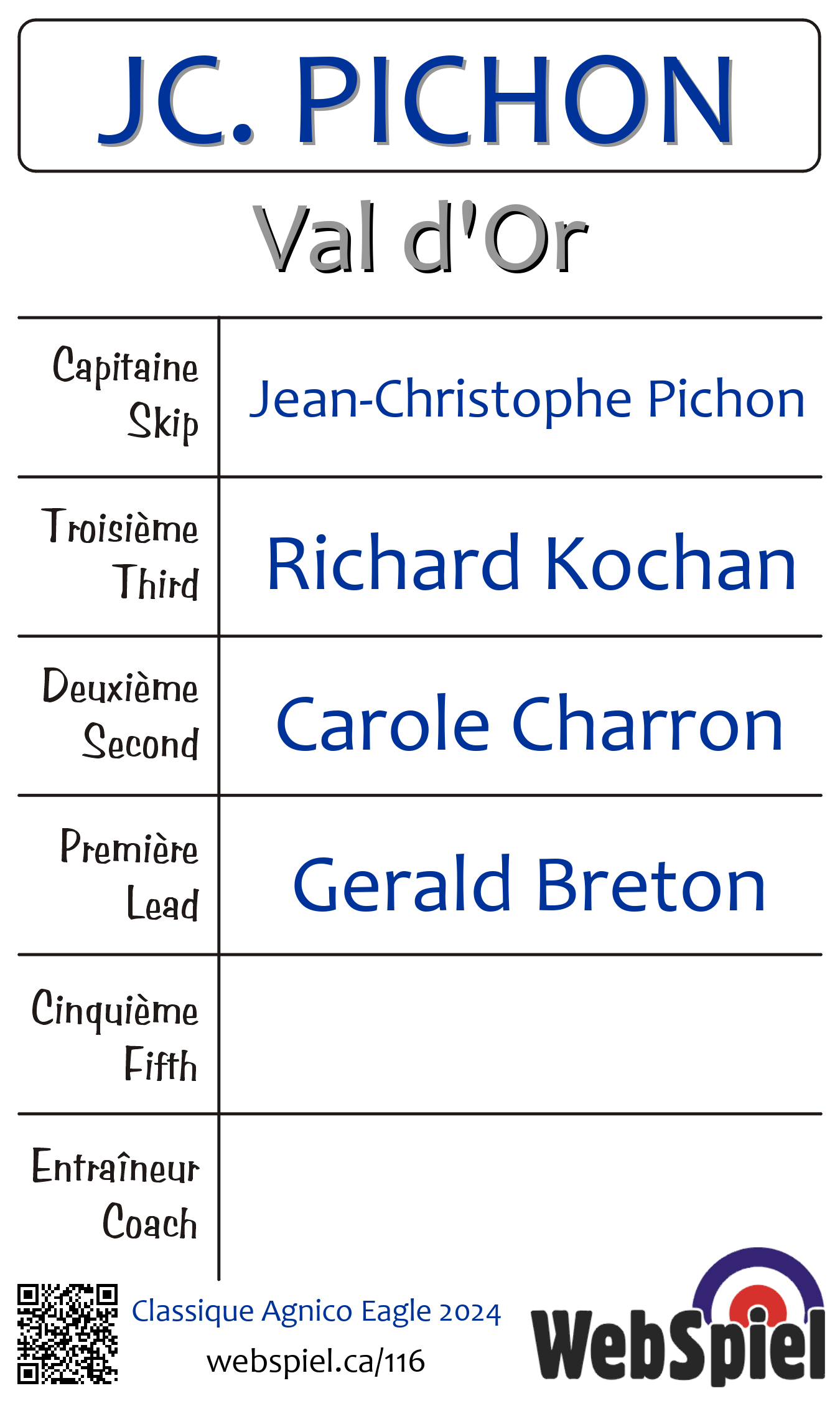 Samedi le 16 mars 2024, à 19h00 EDT Club de curling du Belvédère, Glace 4 · D, Gagnant › C17, Perdant › Éliminé | |||||||||