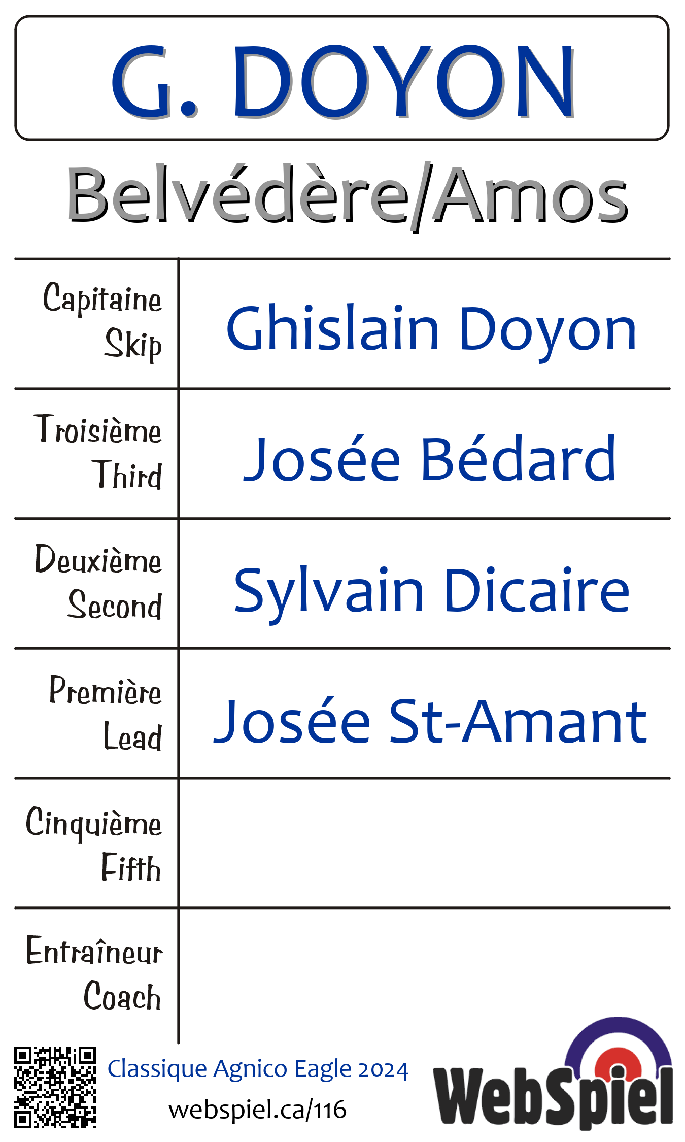 Samedi le 16 mars 2024, à 21h00 EDT Club de curling du Belvédère, Glace 2 · B, Gagnant › A35, Perdant › Éliminé | |||||||||