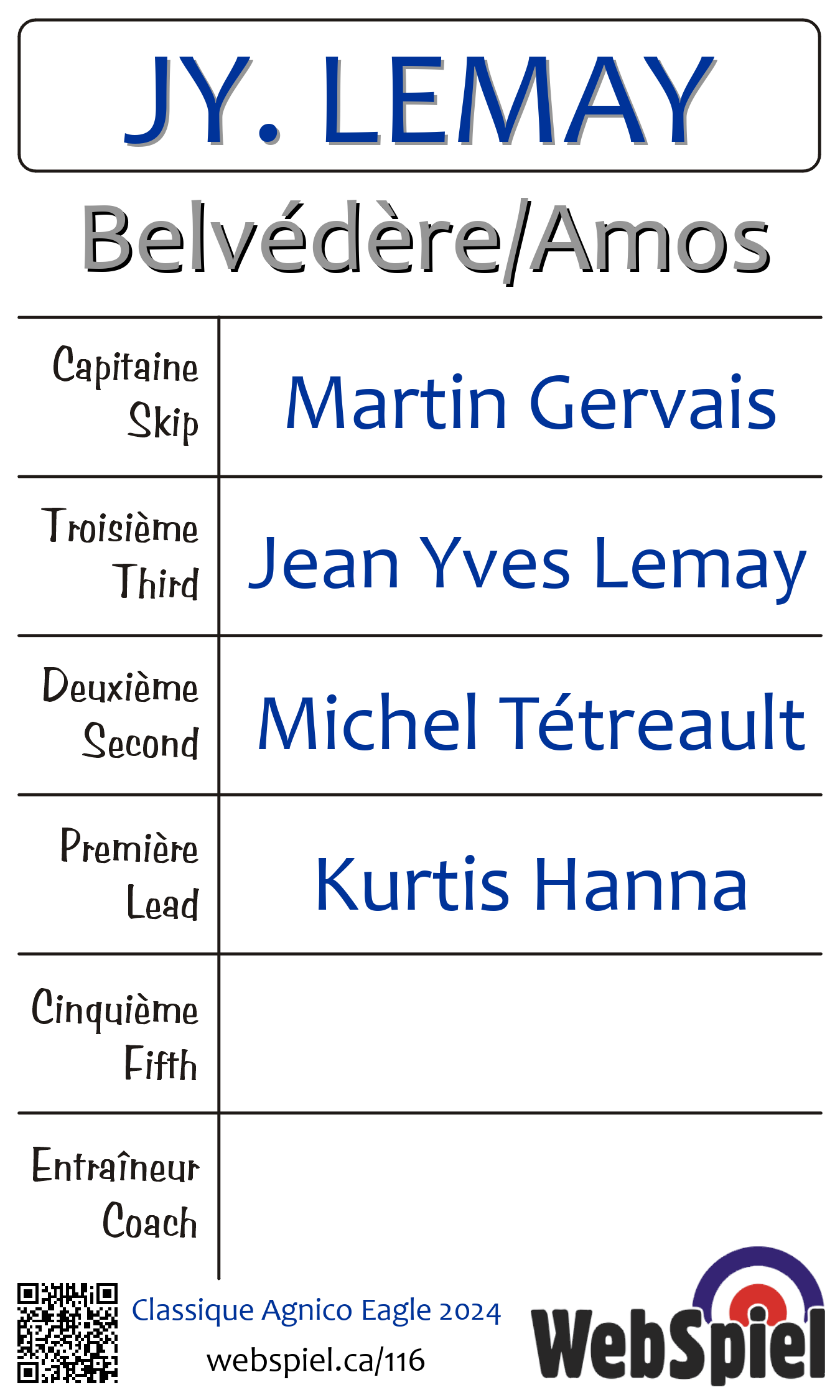 Samedi le 16 mars 2024, à 21h00 EDT Club de curling du Belvédère, Glace 4 · D, Gagnant › A36, Perdant › Éliminé | |||||||||