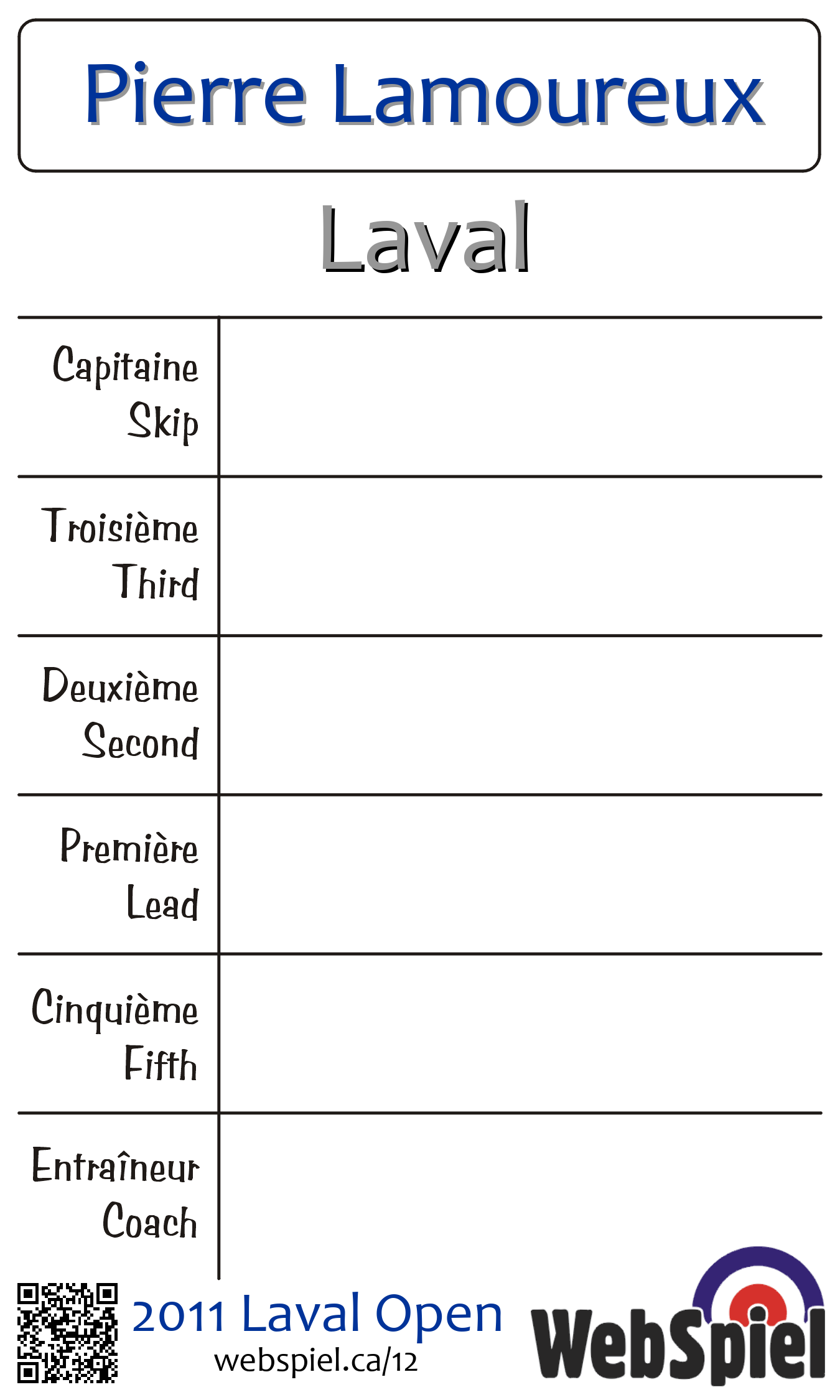| Club | Laval Club de curling Laval-sur-le-Lac 10 rue les Pins Laval-sur-le-Lac, QC H7R 1C7 CANADA T: 450-627-4791 F: 450-627-7511 http://www.curlinglaval.ca 3 glaces |
