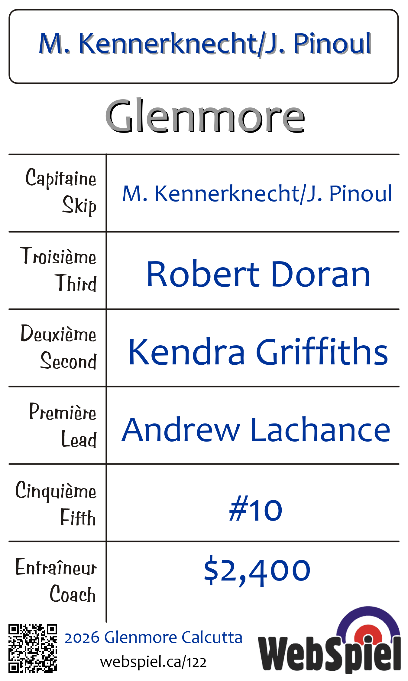 Samedi le 7 février 2026, à 10h00 EST Glenmore Curling Club, Glace 213 · C, Gagnant › D08, Perdant › Éliminé | |||||||||