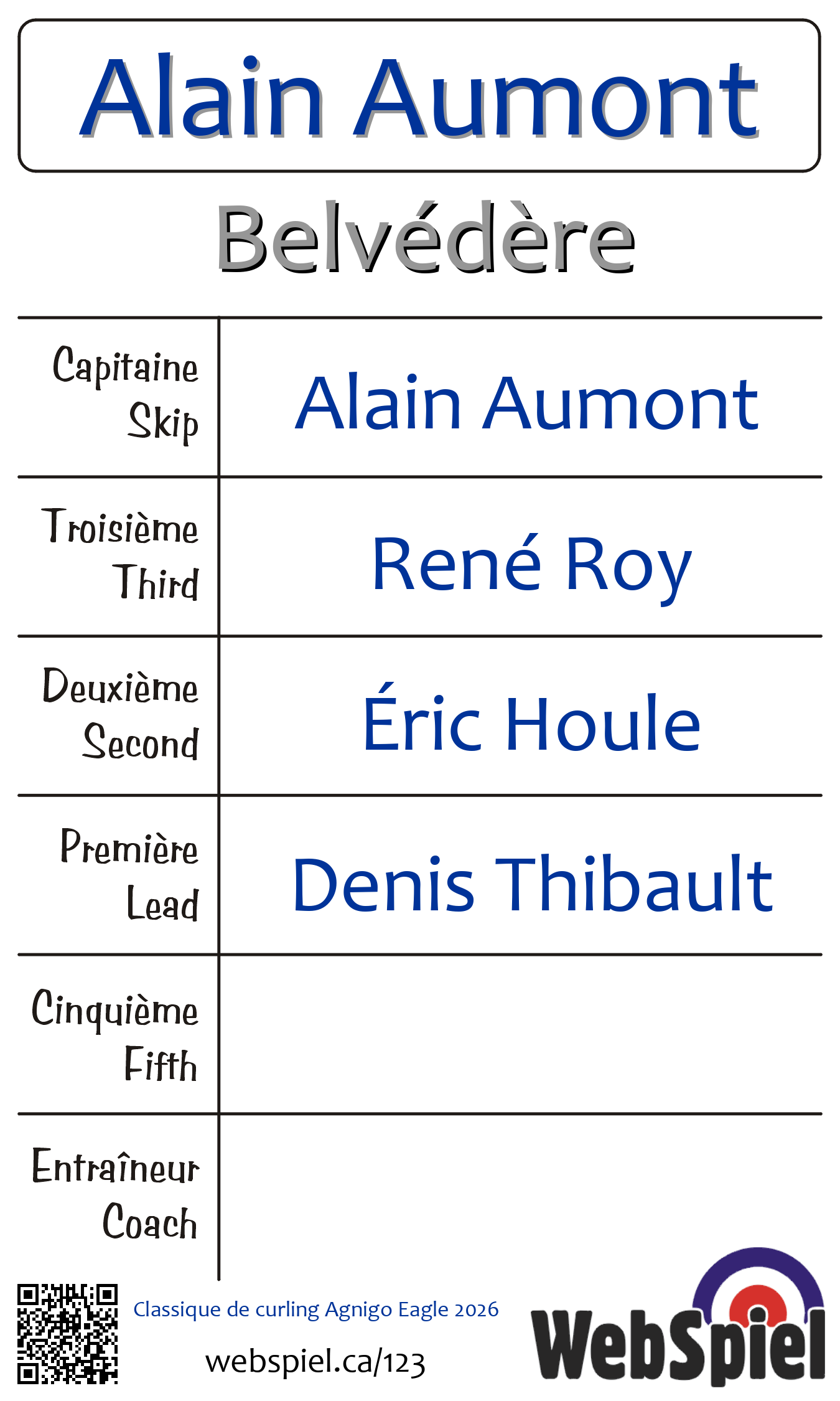 Samedi le 7 février 2026, à 21h00 EST Club de curling du Belvédère, Glace 2 · B, Gagnant › D06, Perdant › Éliminé | |||||||||