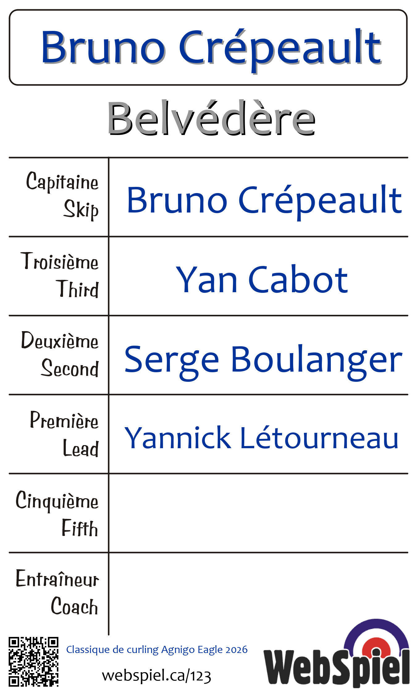Jeudi le 5 février 2026, à 20h30 EST Club de curling du Belvédère, Glace 2 · B, Gagnant › A20, Perdant › C06 | |||||||||