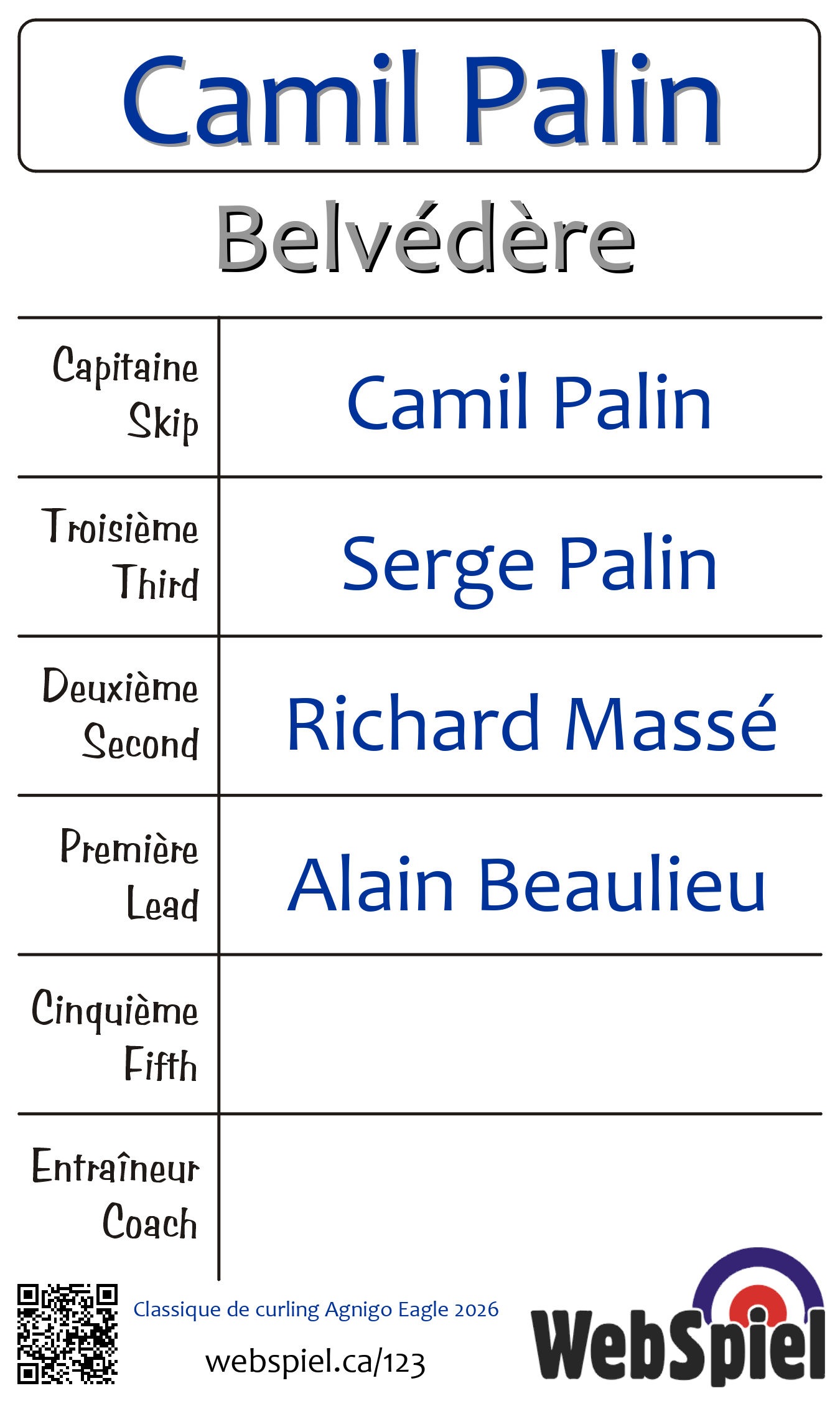 Vendredi le 6 février 2026, à 21h00 EST Club de curling du Belvédère, Glace 3 · C, Gagnant › A21, Perdant › C04 | |||||||||
