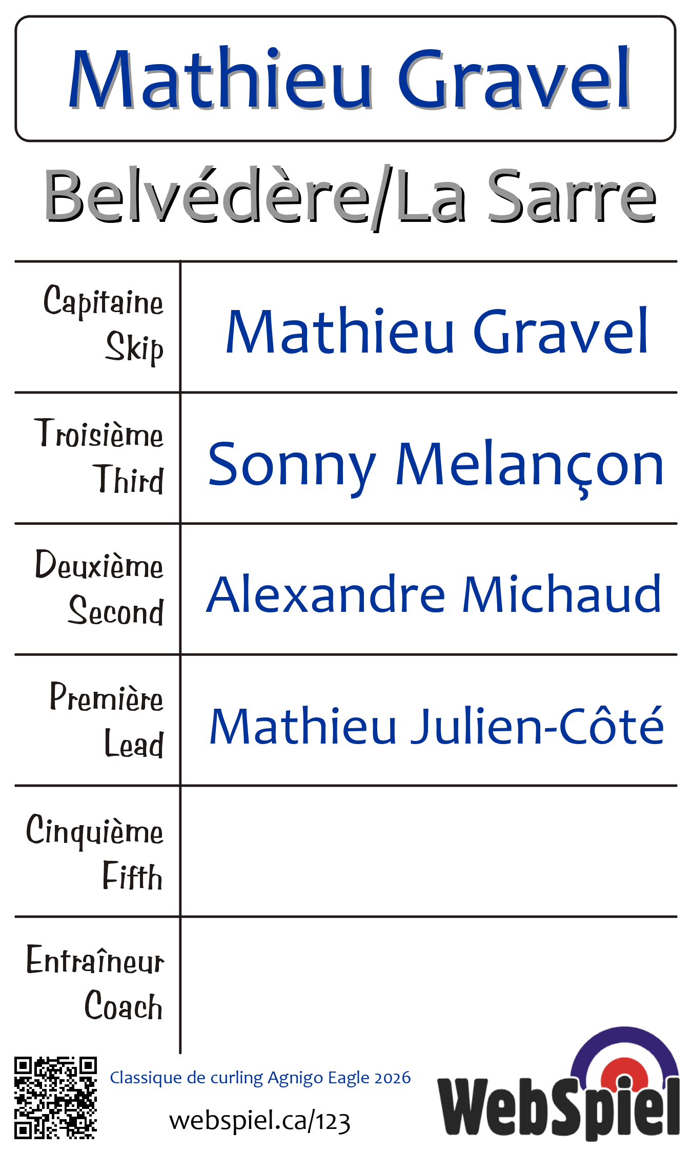 Samedi le 7 février 2026, à 19h00 EST Club de curling du Belvédère, Glace 3 · C, Gagnant › A29, Perdant › Éliminé | |||||||||