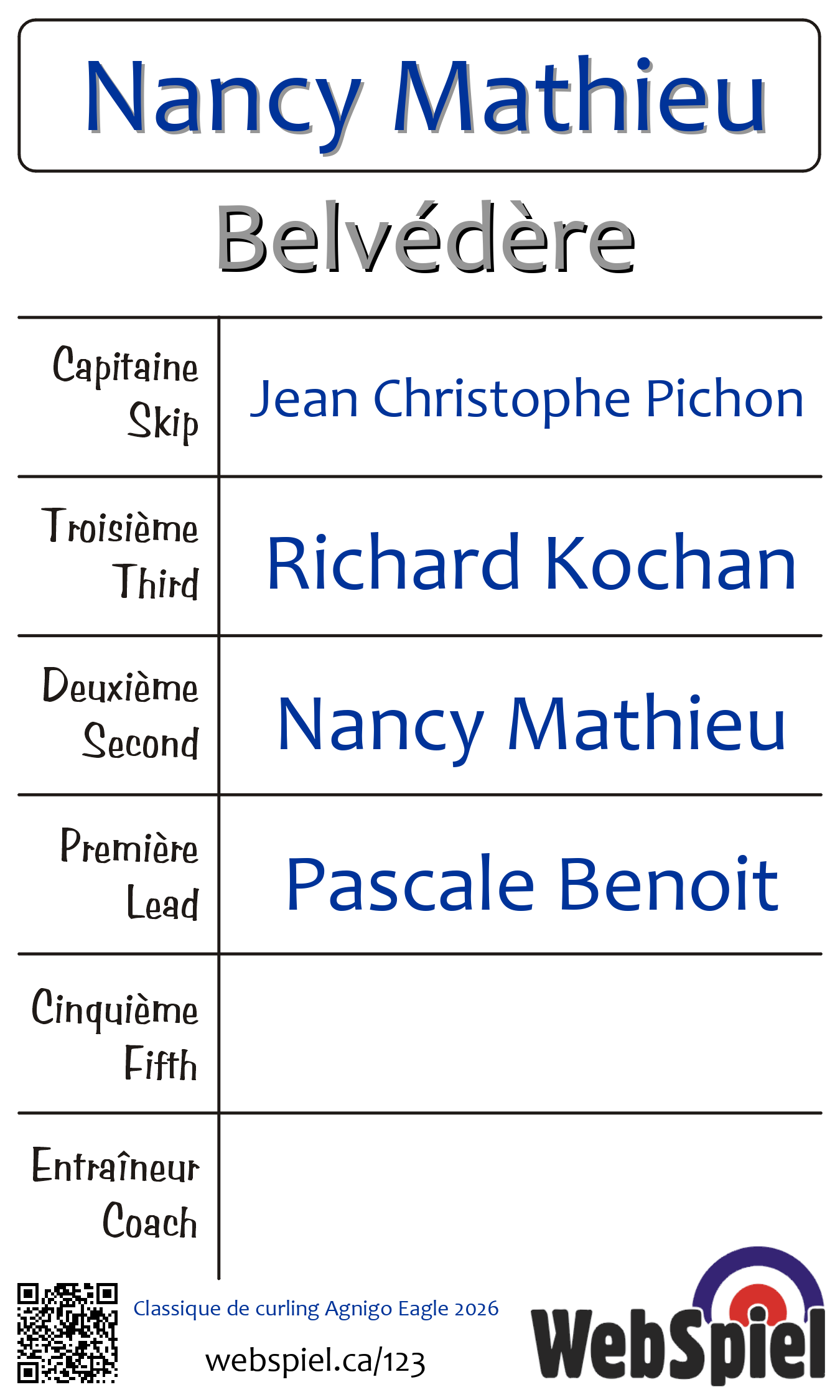 Jeudi le 5 février 2026, à 18h30 EST Club de curling du Belvédère, Glace 3 · C, Gagnant › A19, Perdant › C01 | |||||||||