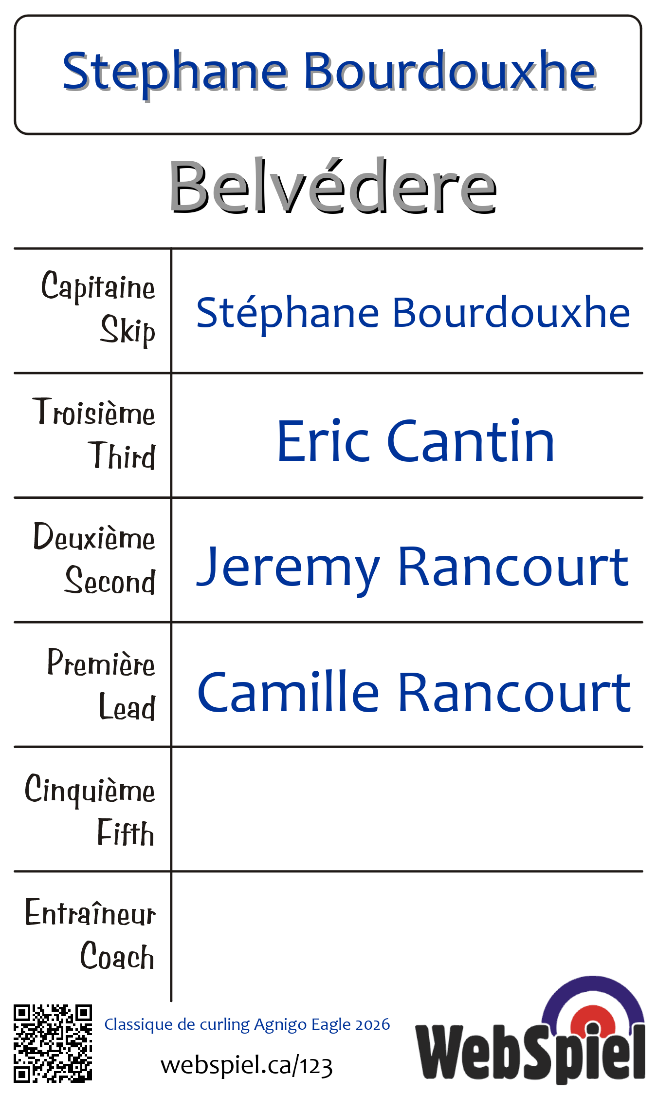 Samedi le 7 février 2026, à 21h00 EST Club de curling du Belvédère, Glace 1 · A, Gagnant › D06, Perdant › Éliminé | |||||||||