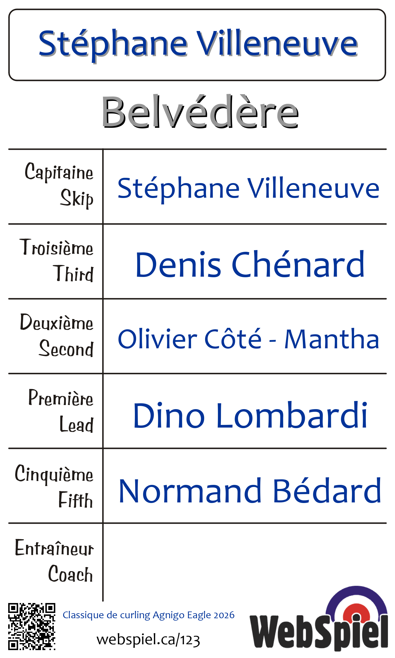 Jeudi le 5 février 2026, à 18h30 EST Club de curling du Belvédère, Glace 4 · D, Gagnant › A22, Perdant › C03 | |||||||||