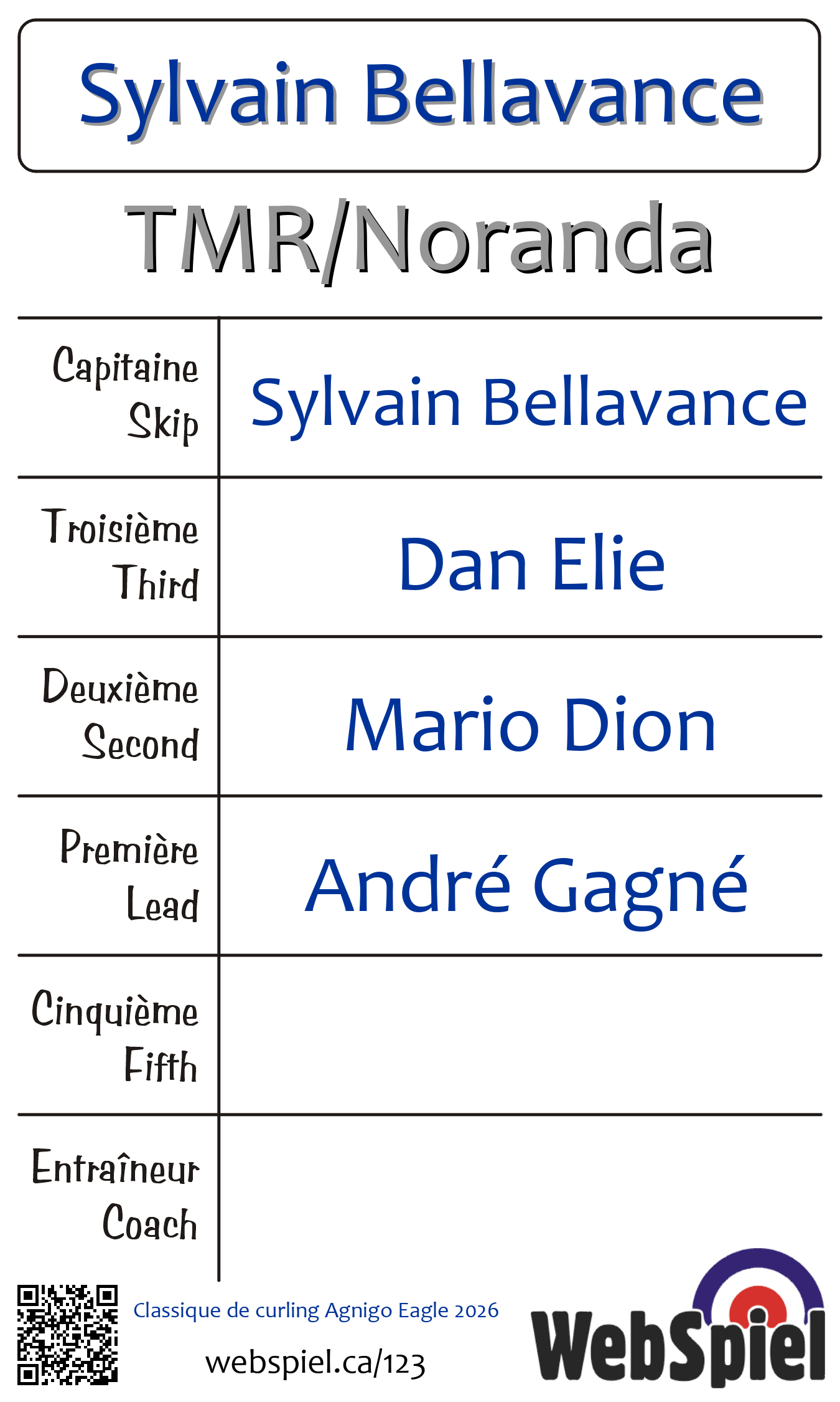 Dimanche le 8 février 2026, à 8h00 EST Club de curling du Belvédère, Glace 3 · C, Gagnant › B06, Perdant › Éliminé | |||||||||