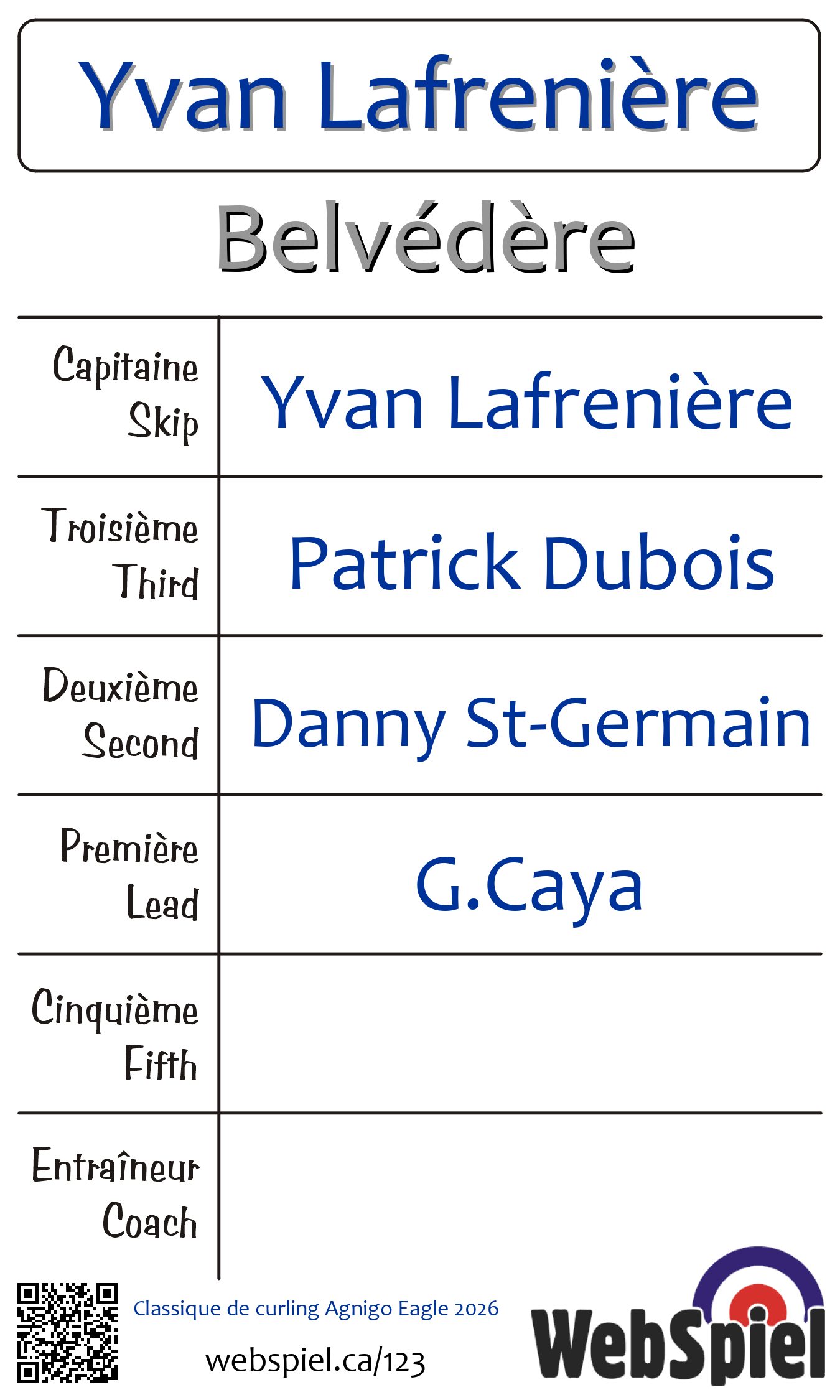 Samedi le 7 février 2026, à 17h00 EST Club de curling du Belvédère, Glace 2 · B, Gagnant › C14, Perdant › Éliminé | |||||||||