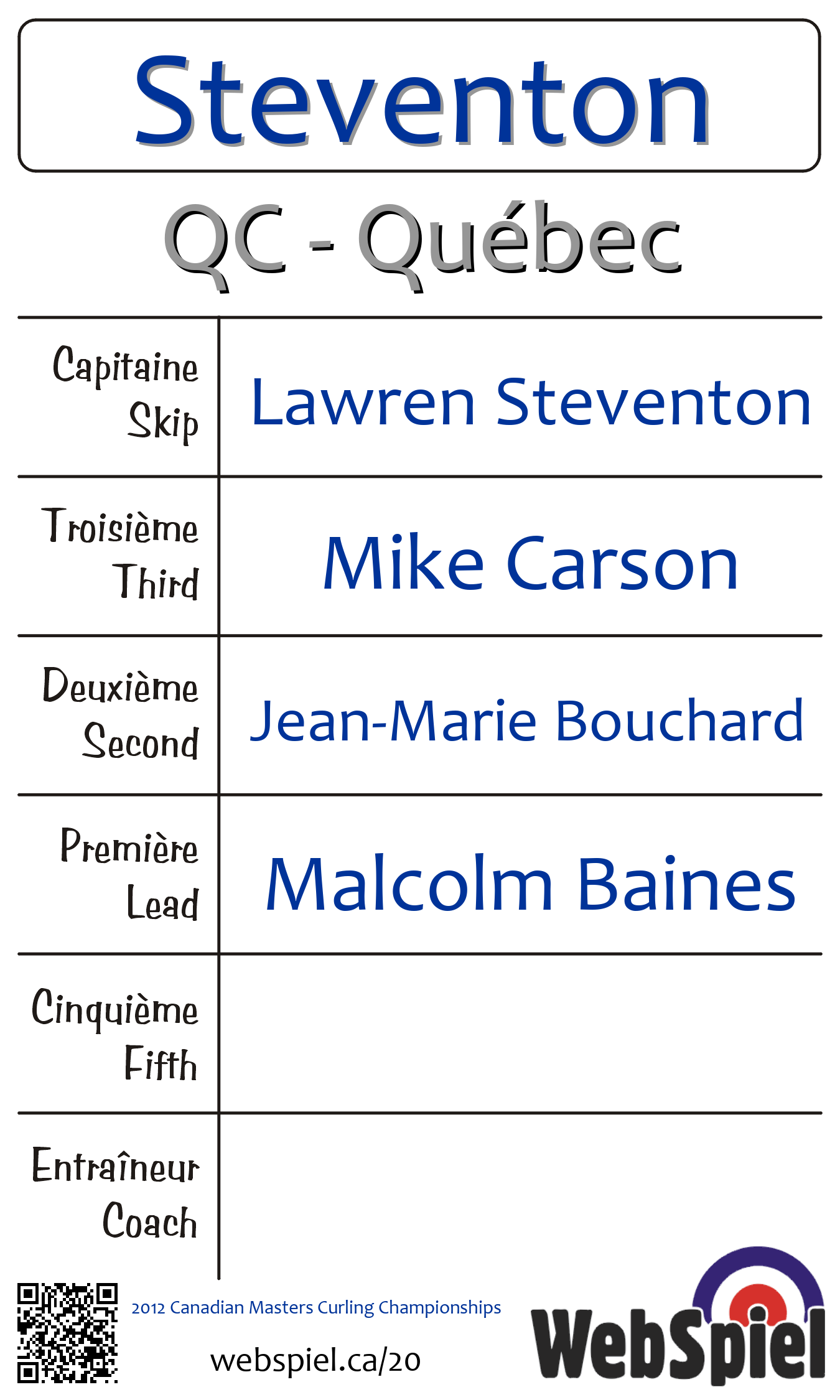 Mardi le 27 mars 2012, à 19h00 EDT Club de curling St-Lambert, Glace 152 · B | |||||||||