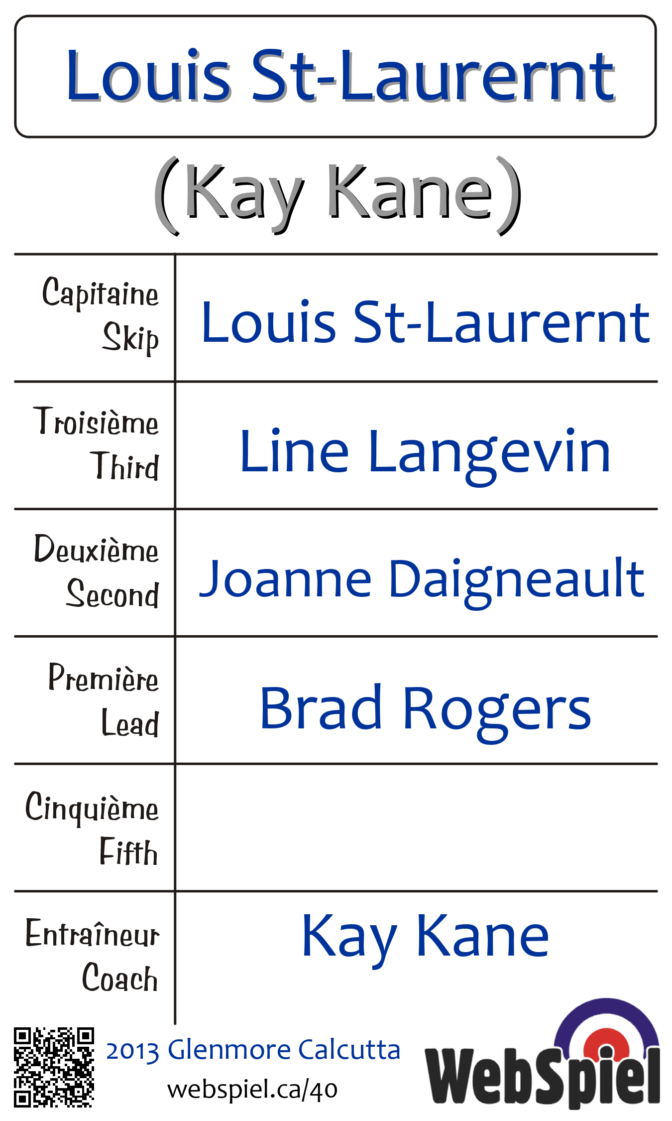 Mardi le 5 février 2013, à 19h00 EST Glenmore Curling Club, Glace 214, Gagnant › B05, Perdant › D01 | |||||||||