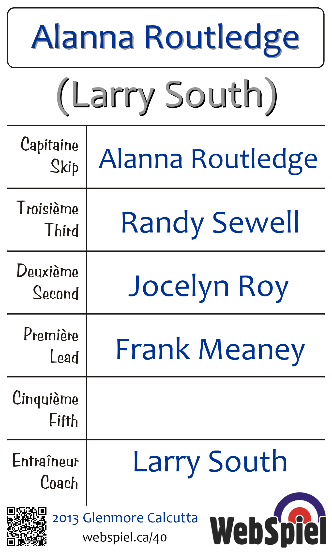 Lundi le 4 février 2013, à 21h00 EST Glenmore Curling Club, Glace 212, Gagnant › A11, Perdant › B01 | |||||||||
