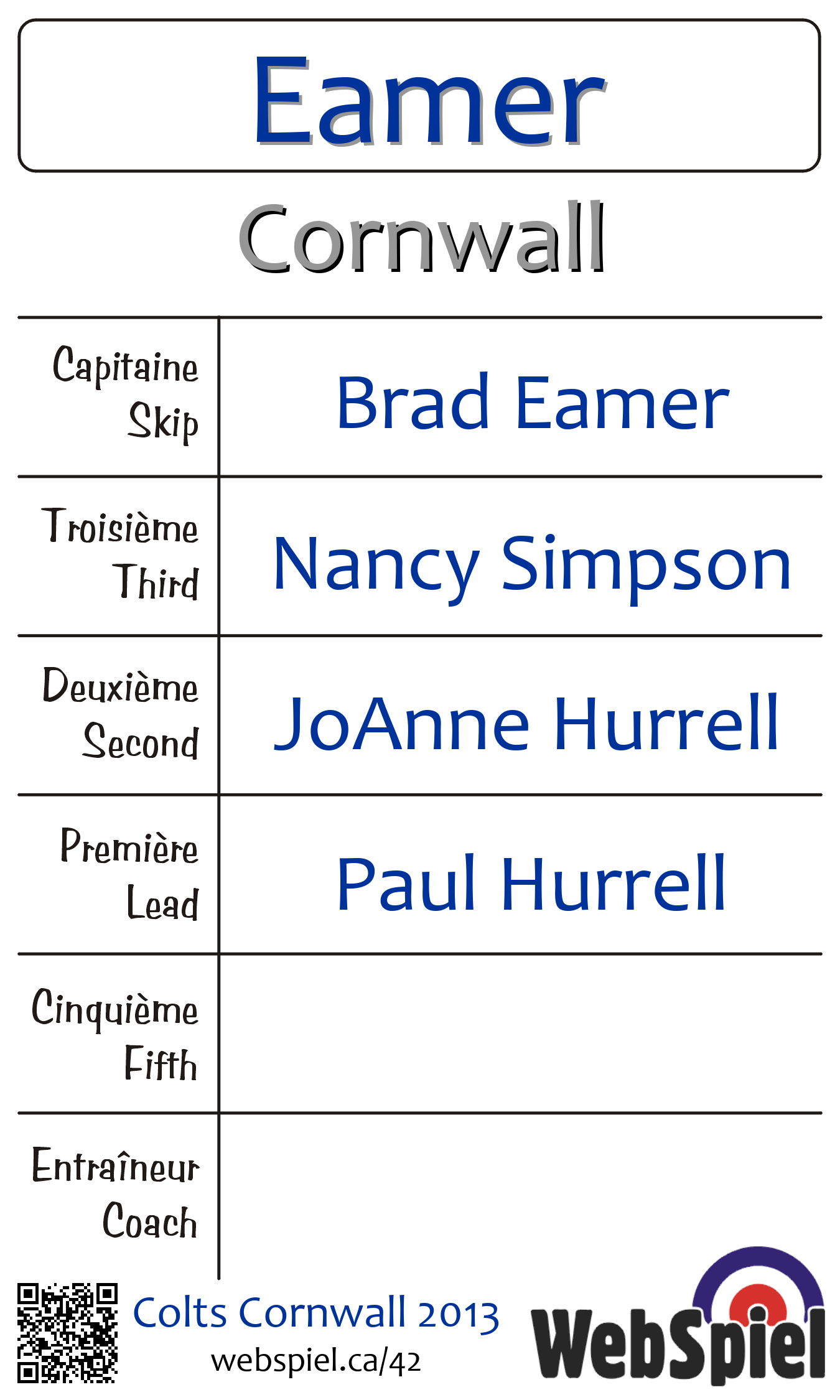 | Club | Cornwall Cornwall Curling Centre 220 Water St. E., PO Box 803 Cornwall, ON K6H 5T7 CANADA T: +1-613-936-2027 http://www.cornwallcurling.ca/ 6 glaces |
