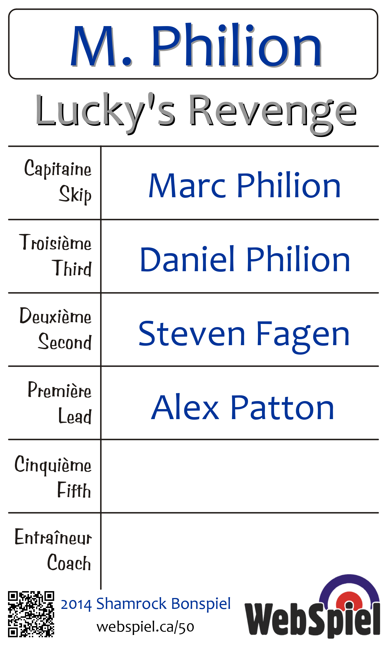 | Club | Lucky's Revenge Montreal West Curling Club 17 Ainslie Road Montréal ouest, QC H4X 1K4 CANADA T: 514-486-5831 http://mtlwestcurl.org/ 4 glaces |