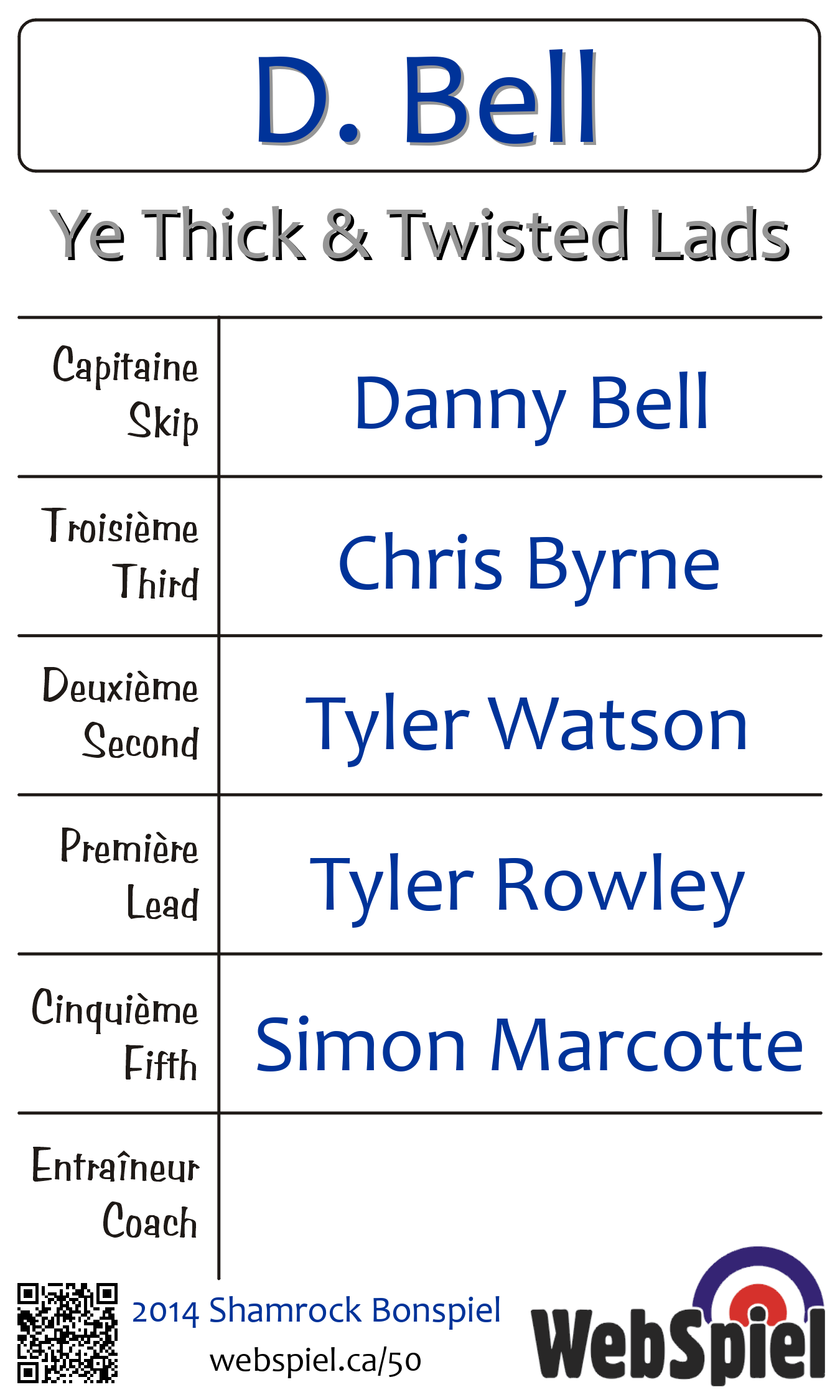 | Club | Ye Thick & Twisted Lads Montreal West Curling Club 17 Ainslie Road Montréal ouest, QC H4X 1K4 CANADA T: 514-486-5831 http://mtlwestcurl.org/ 4 glaces |