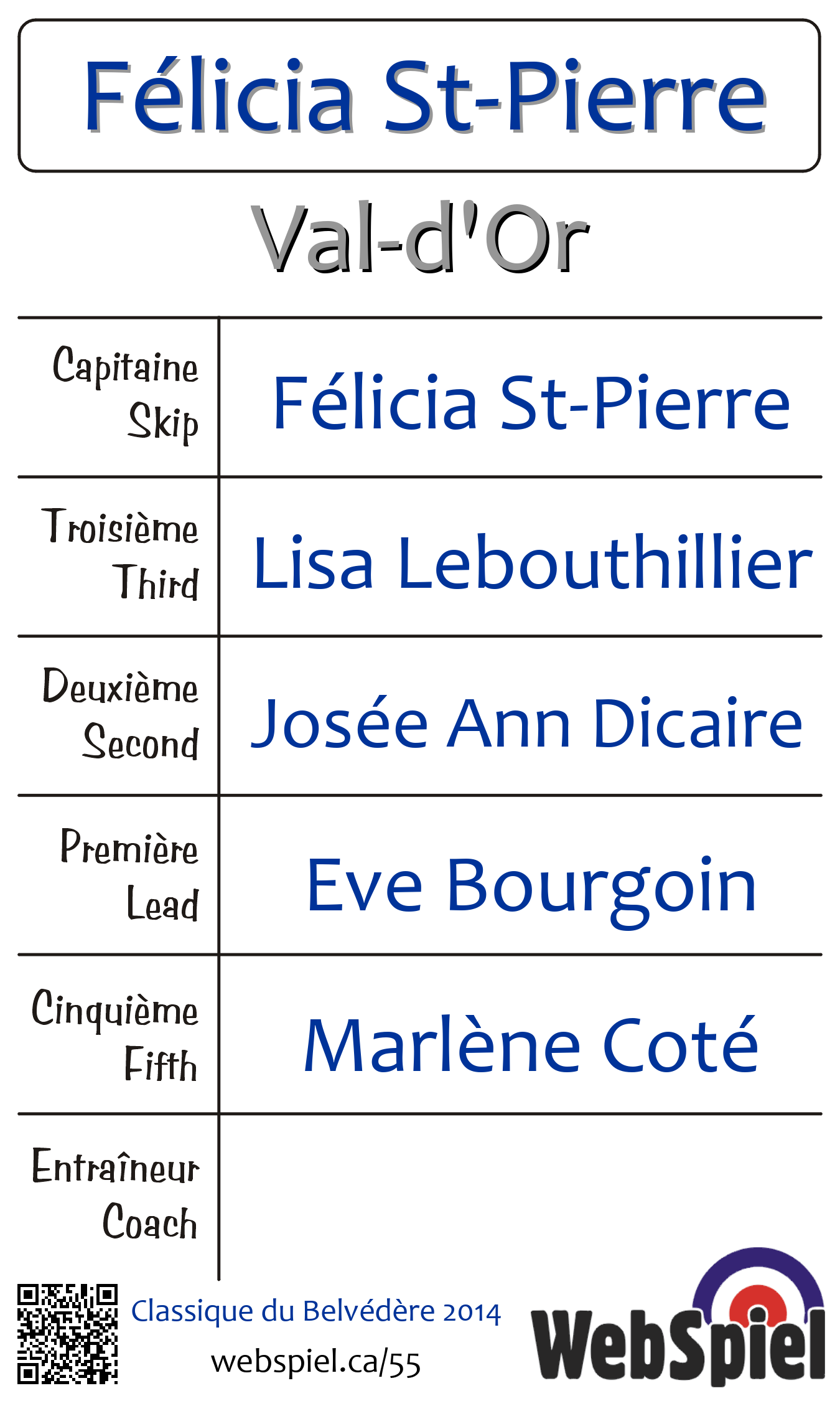 Dimanche le 16 février 2014, à 8h00 EST Club de curling du Belvédère, Glace 3 · C, Gagnant › F19, Perdant › Éliminé | |||||||||