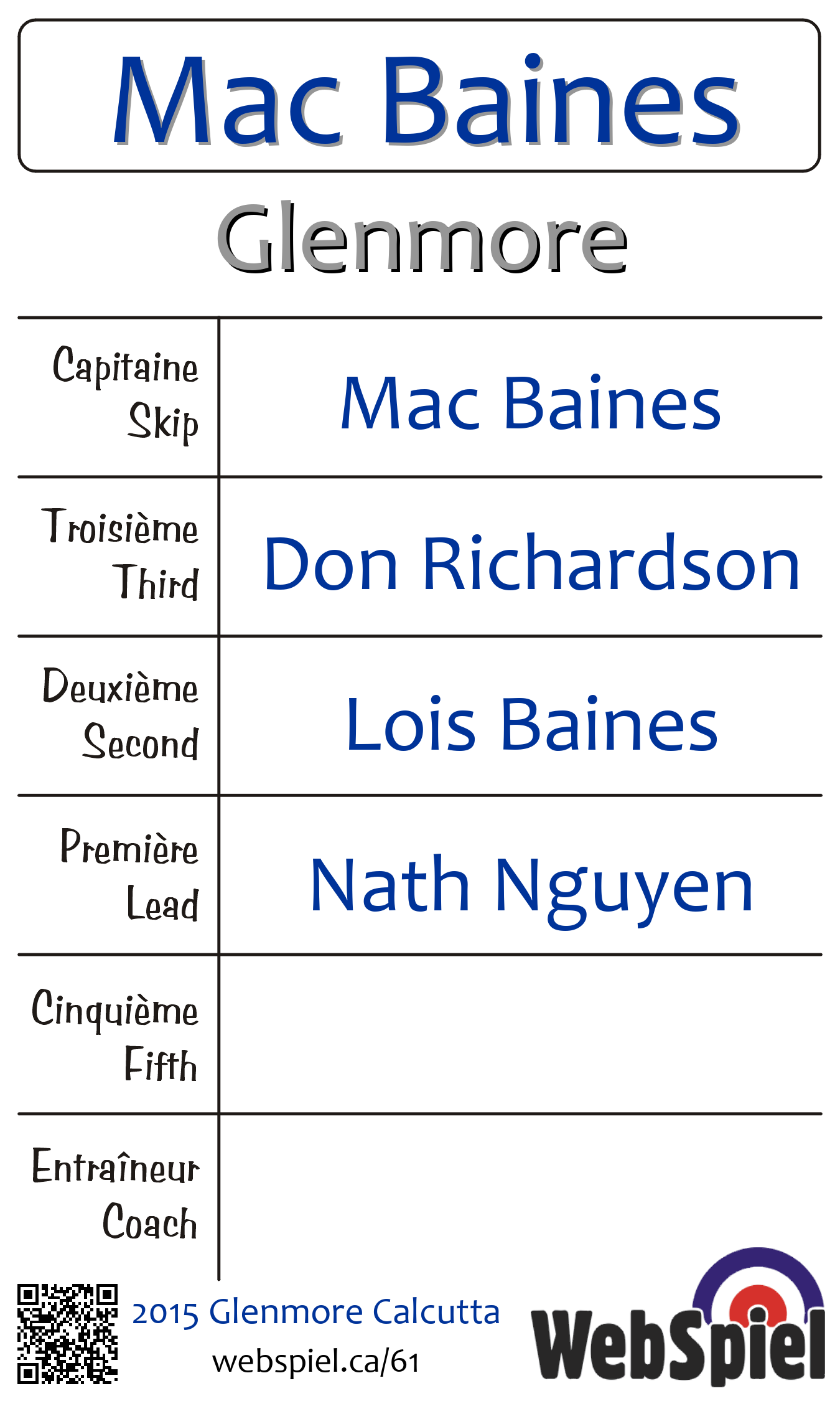 Mardi le 24 février 2015, à 21h00 EST Glenmore Curling Club, Glace 213, Gagnant › A13, Perdant › C01 | |||||||||