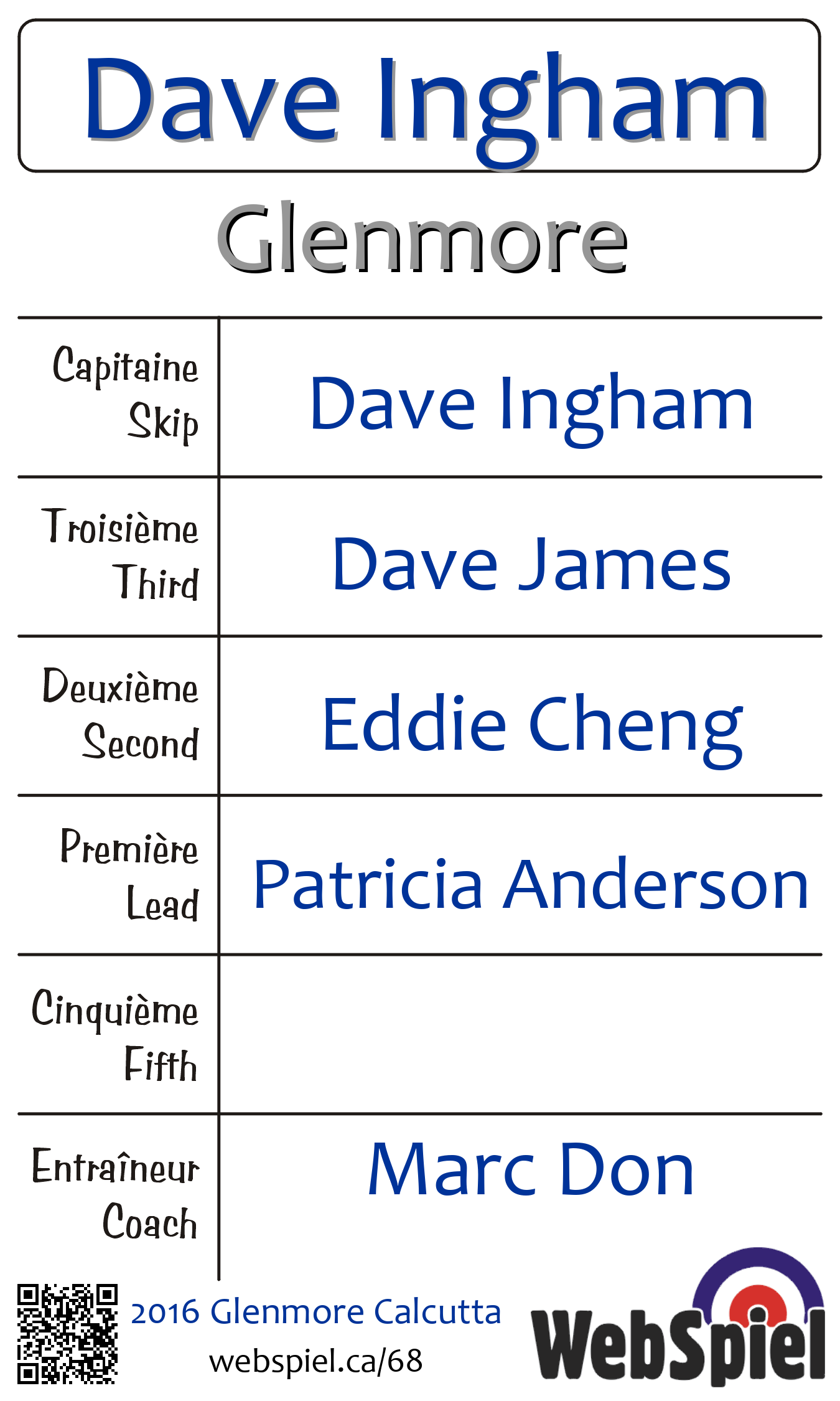 Jeudi le 3 mars 2016, à 19h00 EST Glenmore Curling Club, Glace 211, Gagnant › B07, Perdant › D03 | |||||||||