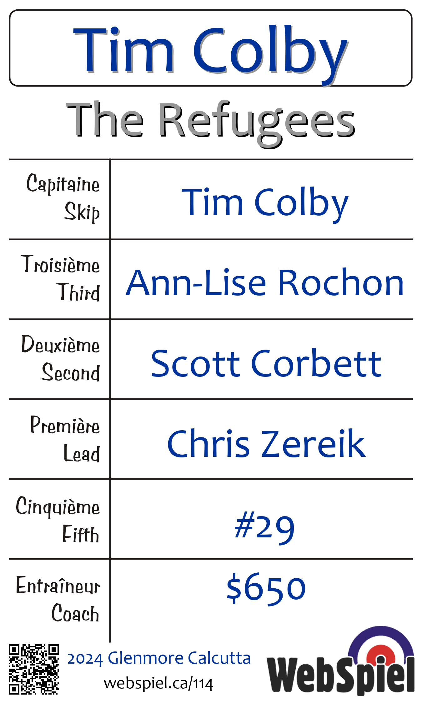Saturday, February 10th, 2024, at 12:00pm EST Glenmore Curling Club, Sheet 213 · C, Winner › D11, Loser › OUT | |||||||||