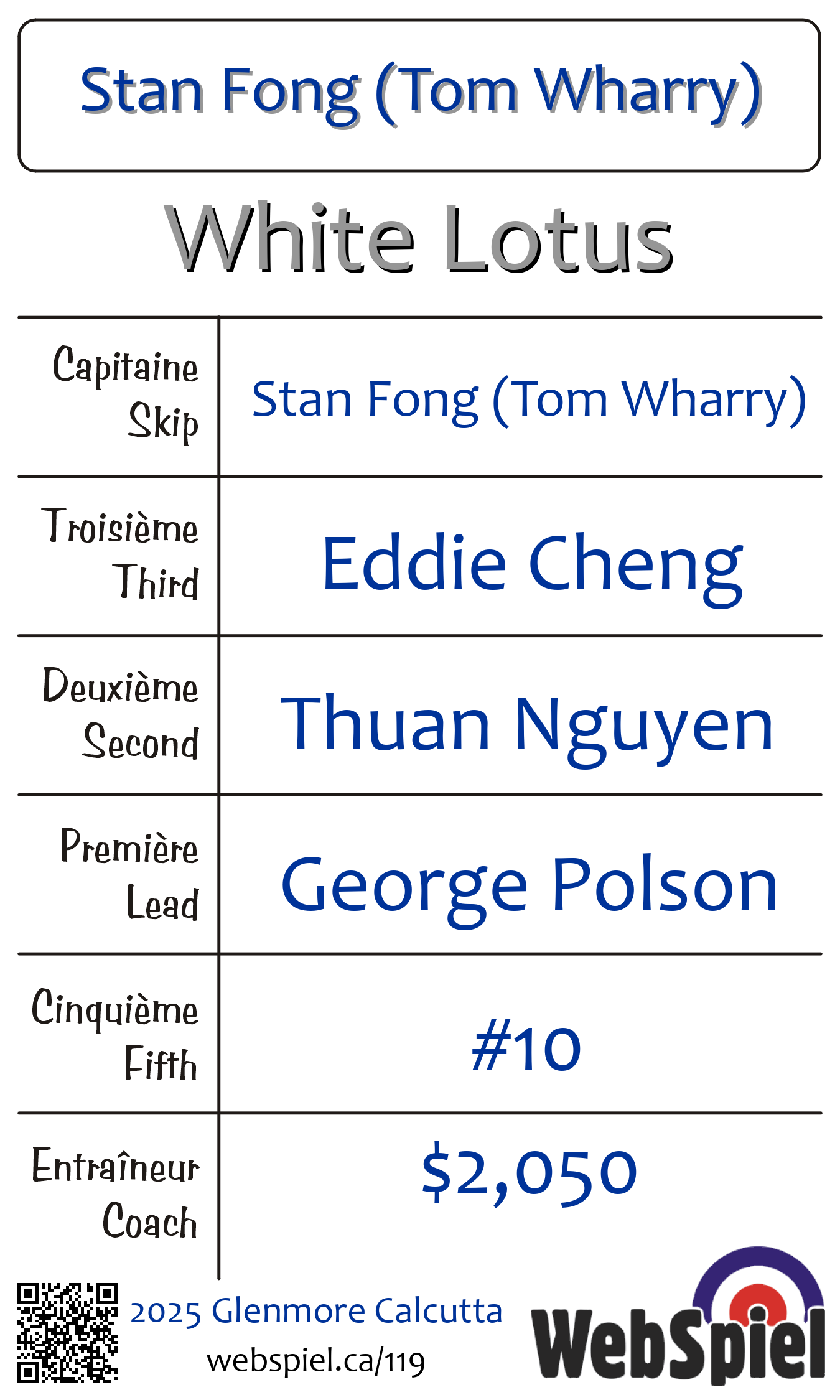 | Team | 3 - Stan Fong (Tom Wharry) |
