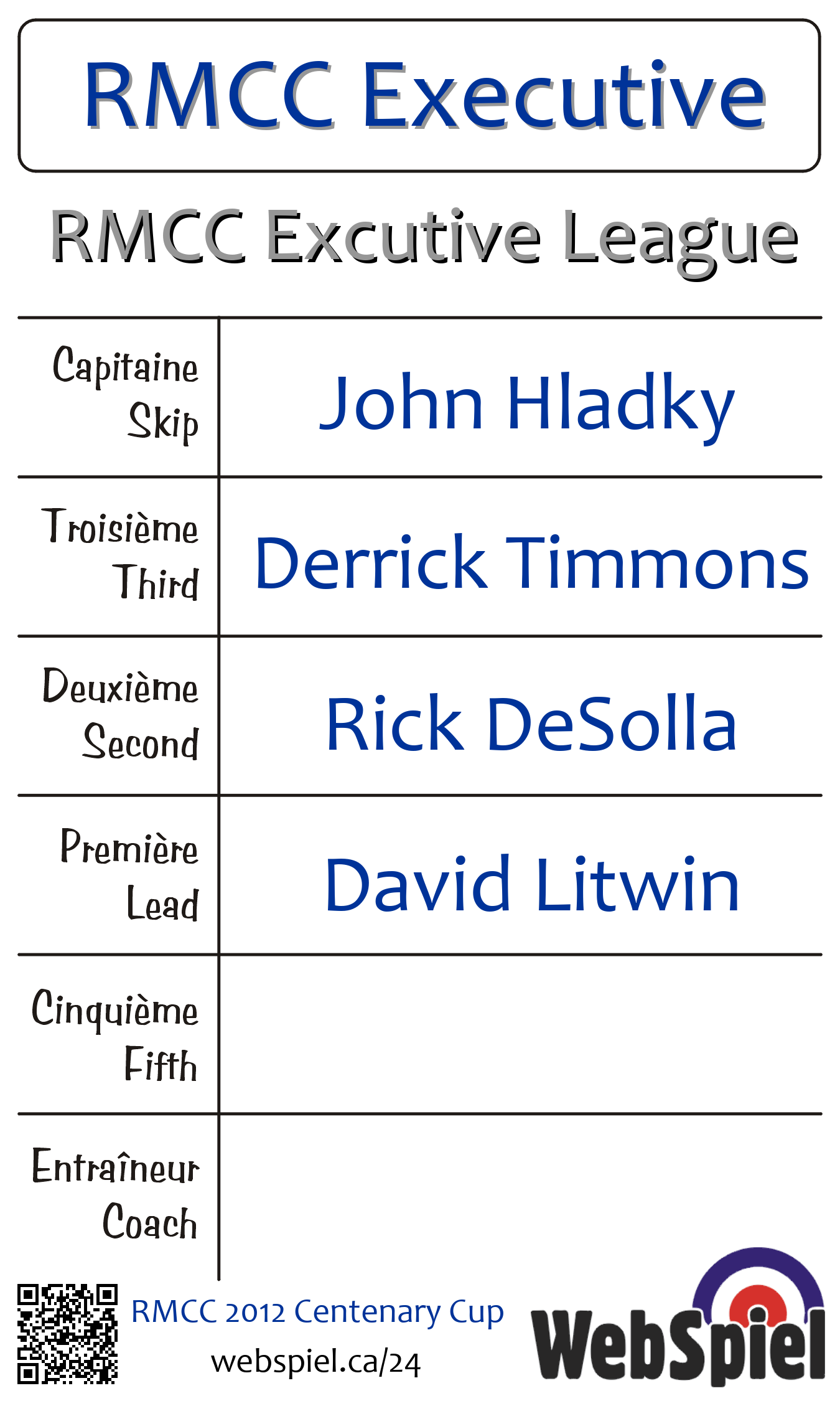 | Club | RMCC Excutive League Royal Montreal Curling Club 1850 Boul. De Maisonneuve Ouest Montréal, QC H3H 2C4 CANADA T: 514-935-3411 http://www.royalmontrealcurling.ca 3 sheets |