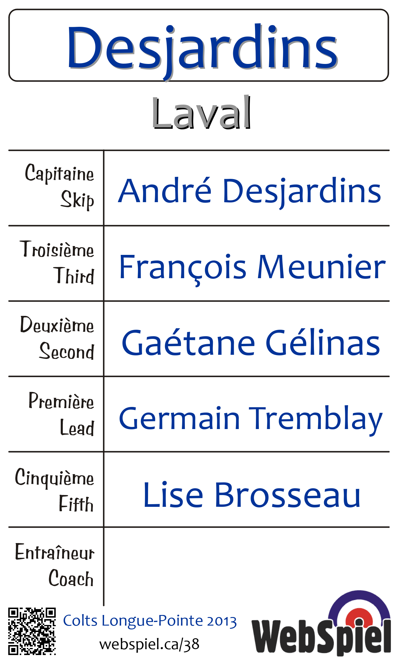 | Club | Laval Club de curling Laval-sur-le-Lac 10 rue les Pins Laval-sur-le-Lac, QC H7R 1C7 CANADA T: 450-627-4791 F: 450-627-7511 http://www.curlinglaval.ca 3 sheets |