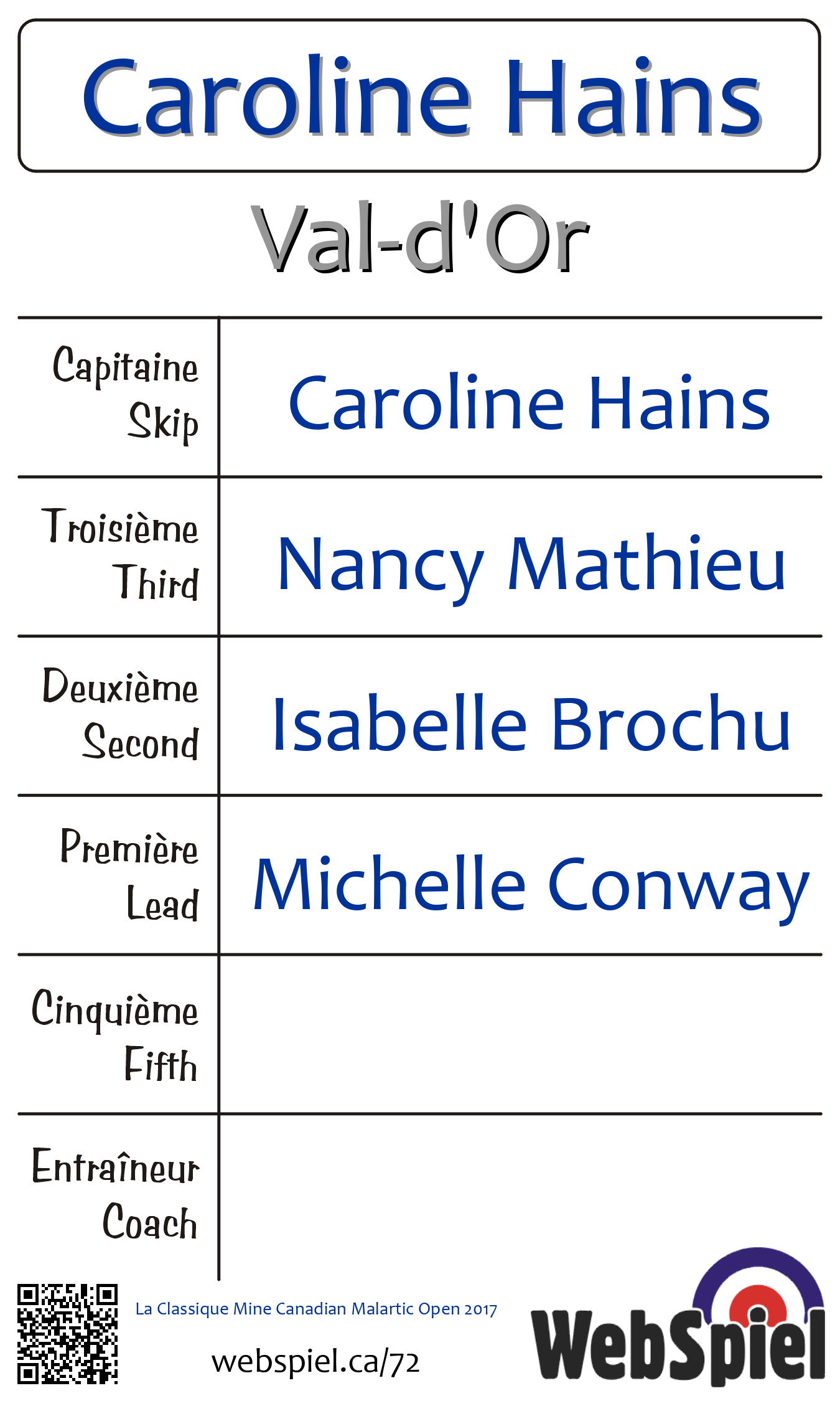 Friday, February 3rd, 2017, at 6:30pm EST Club de curling du Belvédère, Sheet 2 · B, Winner › C13, Loser › D01 | |||||||||