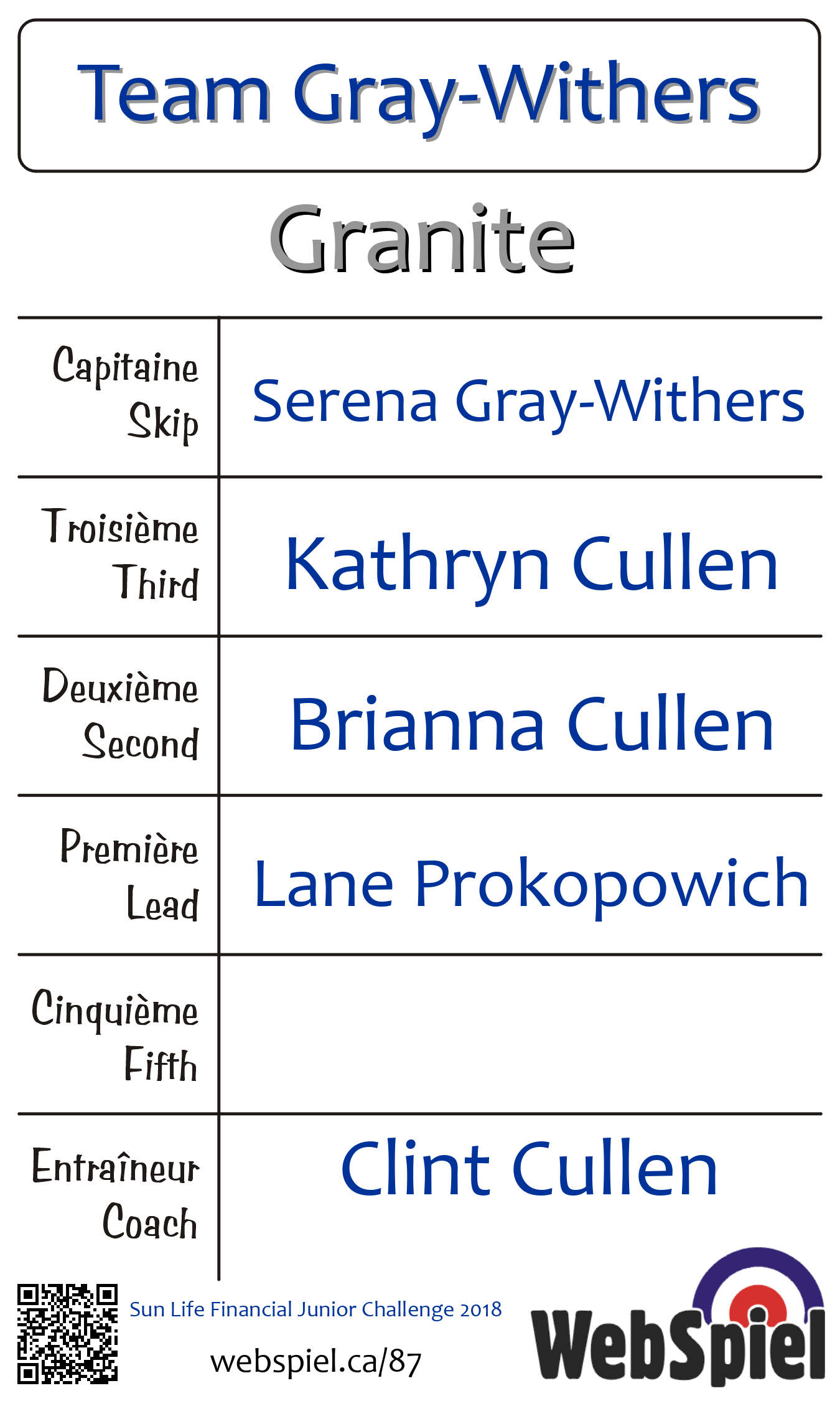 | Club | Granite Granite Curling Club One Granite Way Winnipeg, MB R3C 0Y9 CANADA T: 204-775-8239 F: 204-772-0106 http://www.granitecurlingclub.ca |