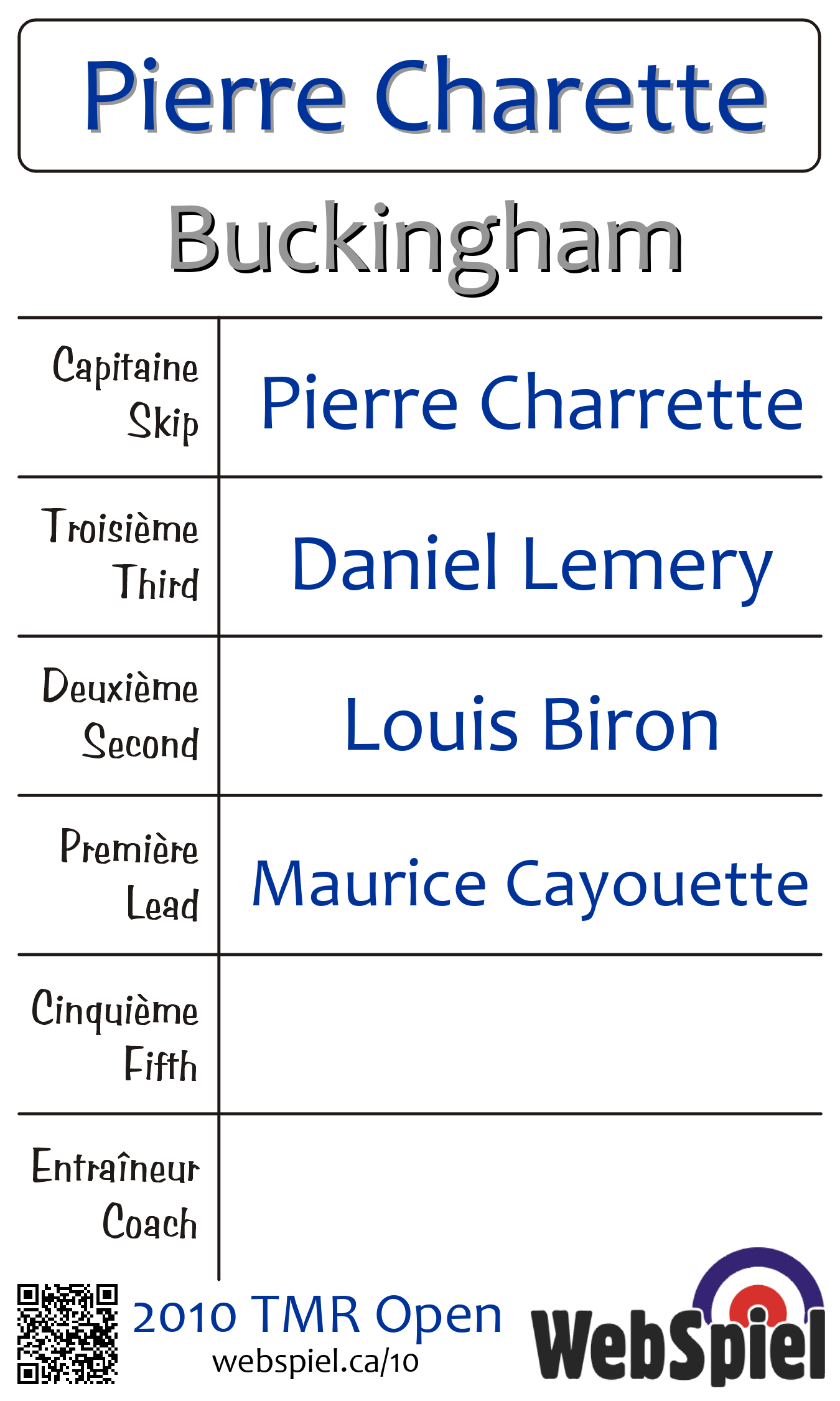 | Club | Buckingham Club de curling Buckingham C.P. 133 Buckingham, QC J8L 2X2 CANADA T: 819-986-3781 http://www.buckingham.ovca.com |