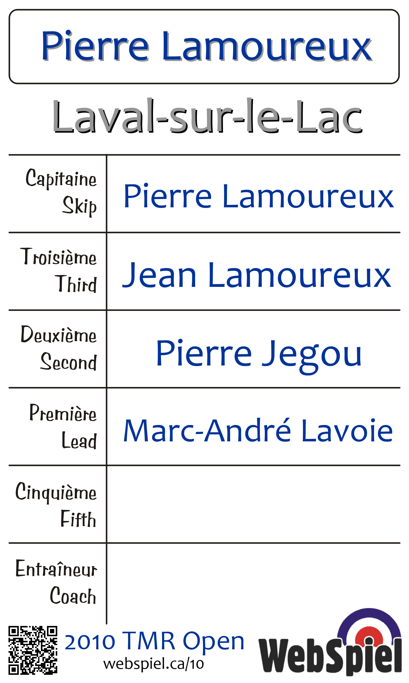 | Club | Laval-sur-le-Lac Club de curling Laval-sur-le-Lac 10 rue les Pins Laval-sur-le-Lac, QC H7R 1C7 CANADA T: 450-627-4791 F: 450-627-7511 http://www.curlinglaval.ca 3 glaces |