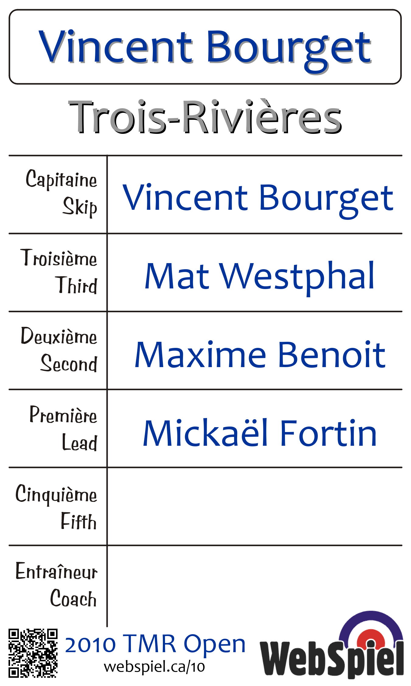 | Club | Trois-Rivières Club de curling Trois-Rivières 630 St-Ursule C.P. 123 Trois-Rivières, QC G9A 1P1 CANADA T: 819-375-1313 F: 819- 375-1313 http://www.curlingtr.com/ |