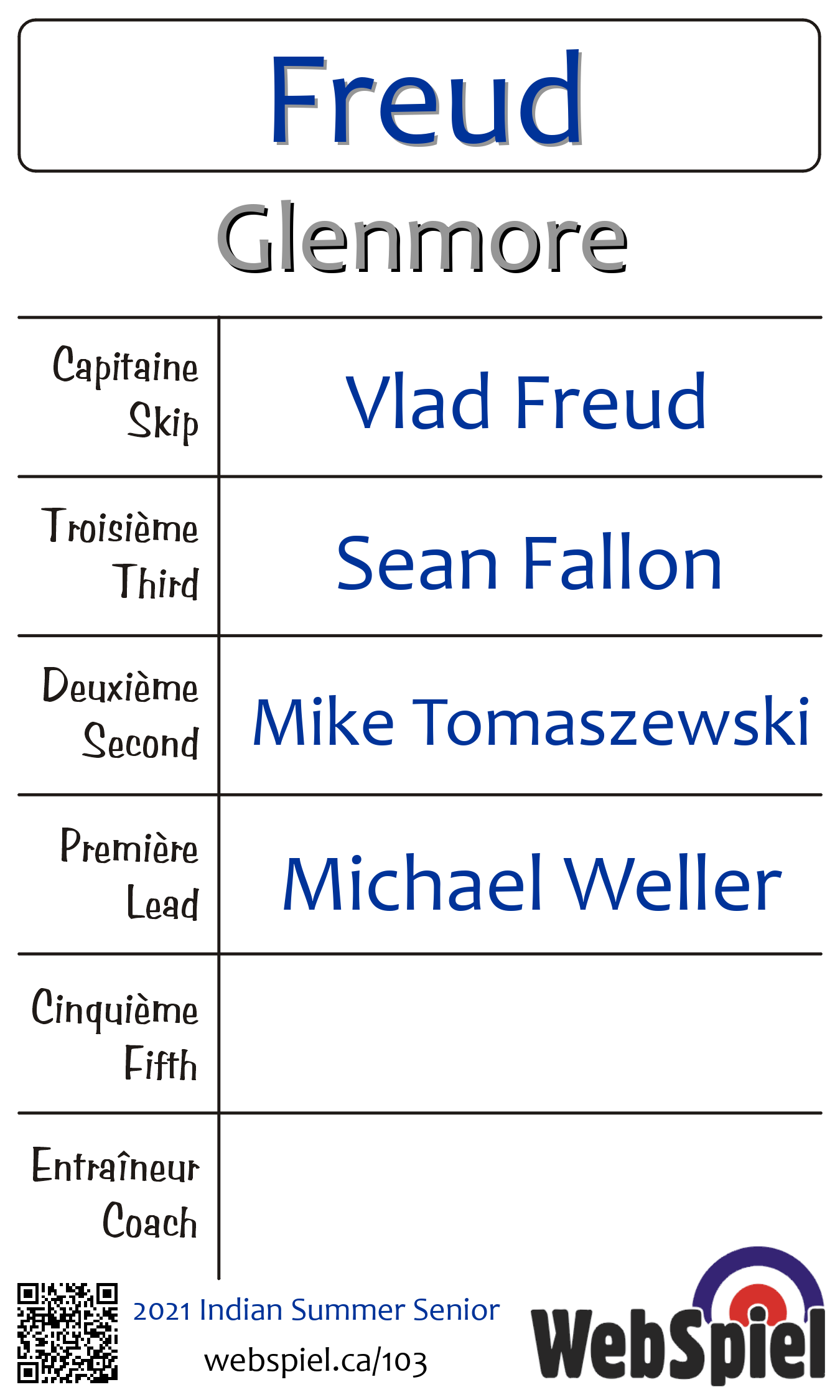 Vendredi le 15 octobre 2021, à 18h45 EDT Glenmore Curling Club, Glace 211 · A, Gagnant › C09, Perdant › D03 | |||||||||