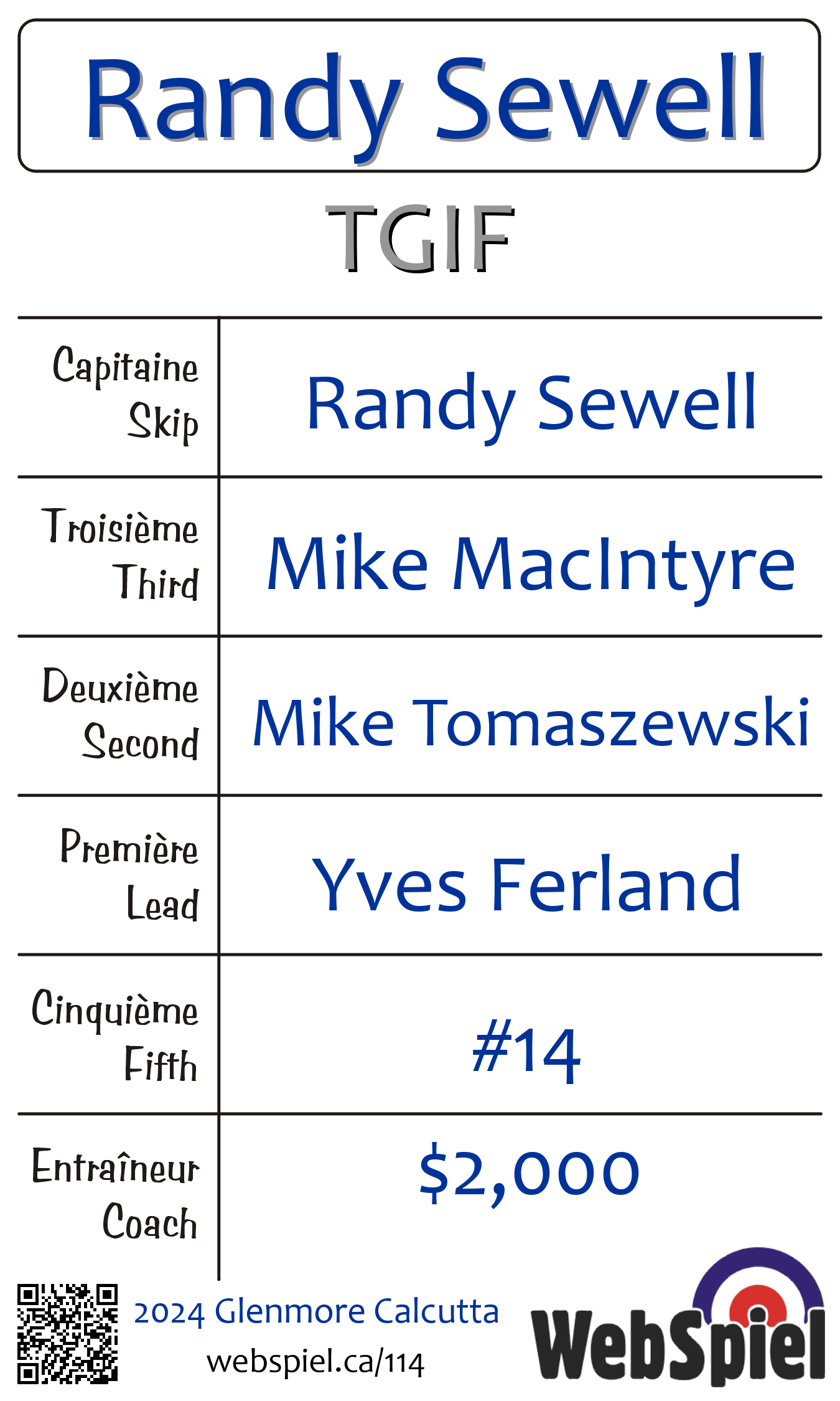 | Club | TGIF Glenmore Curling Club 120 rue Glenmore Dollard-des-Ormeaux, QC H9B 2X9 CANADA T: 514-684-6350 F: 514-684-6352 http://www.glenmorecurling.com 4 glaces |