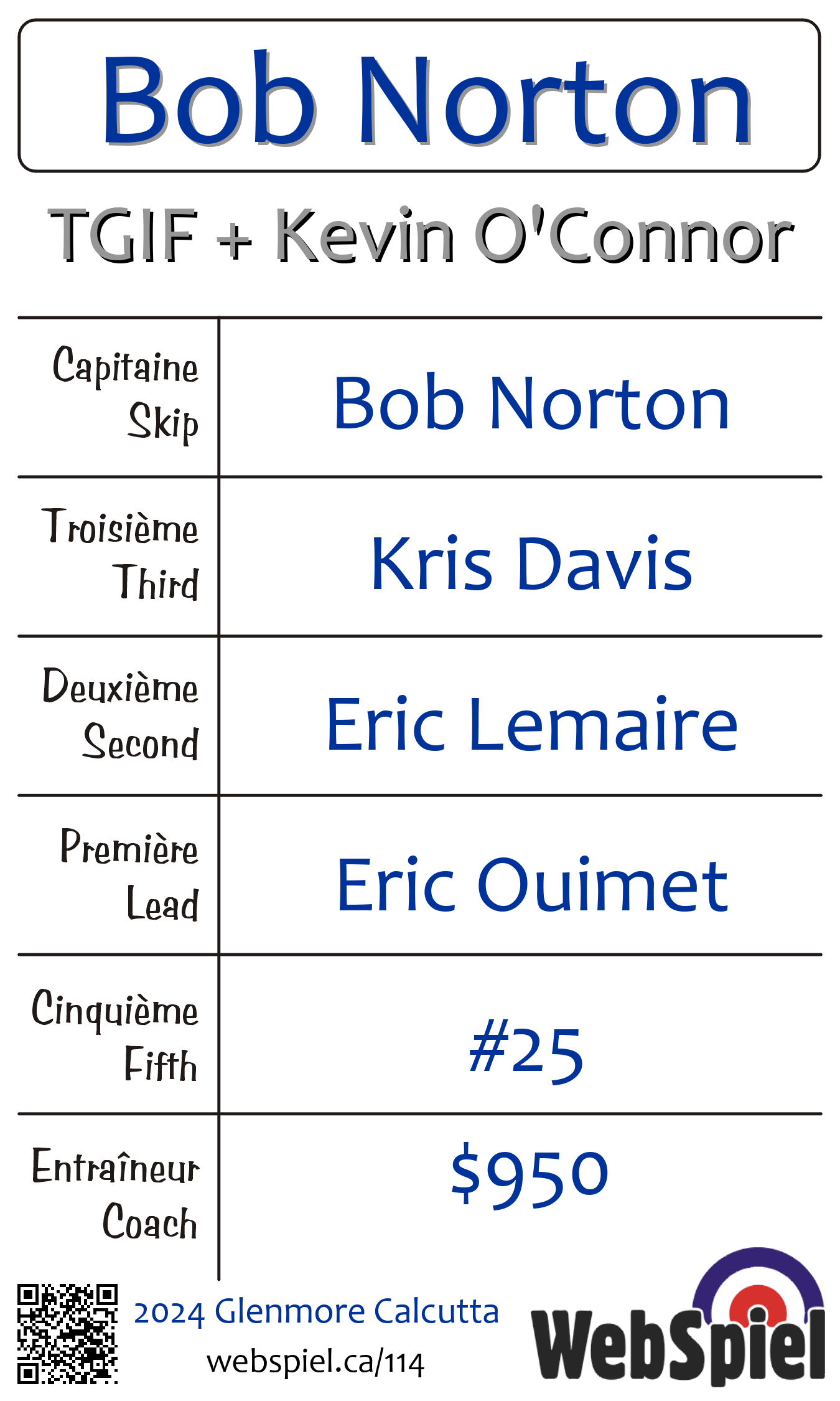 Jeudi le 8 février 2024, à 21h00 EST Glenmore Curling Club, Glace 212 · B, Gagnant › D05, Perdant › Éliminé | |||||||||