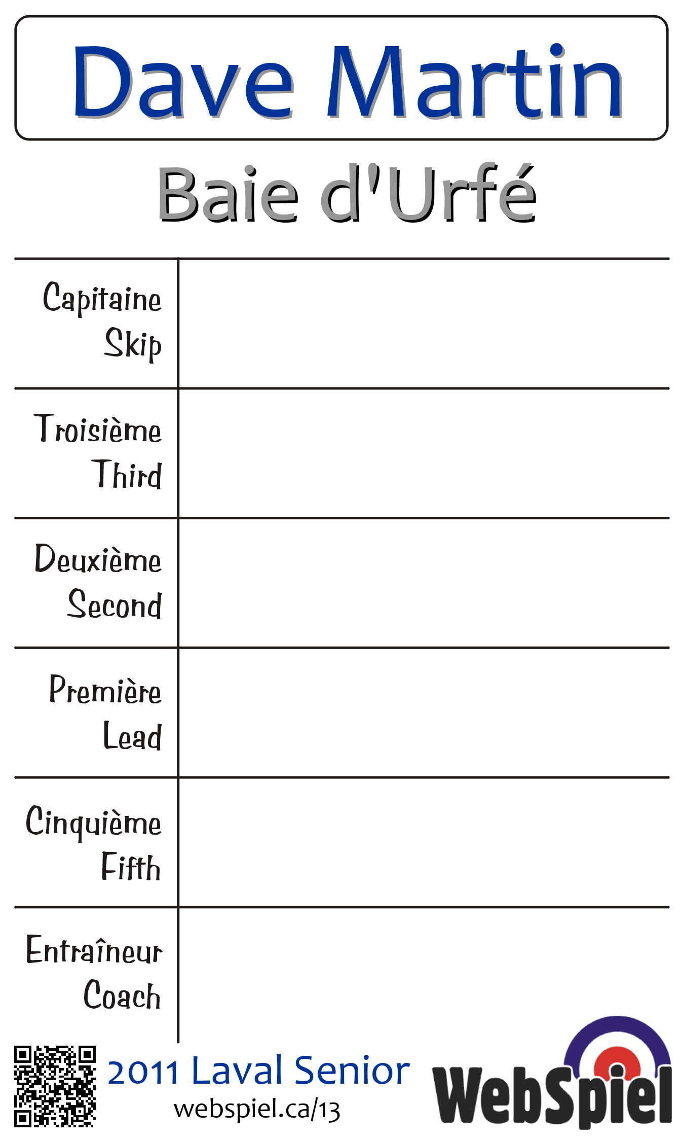 Mardi le 11 janvier 2011, à 21h00 EST Club de curling Laval-sur-le-Lac, Glace 302, Gagnant › A09, Perdant › C01 | |||||||||