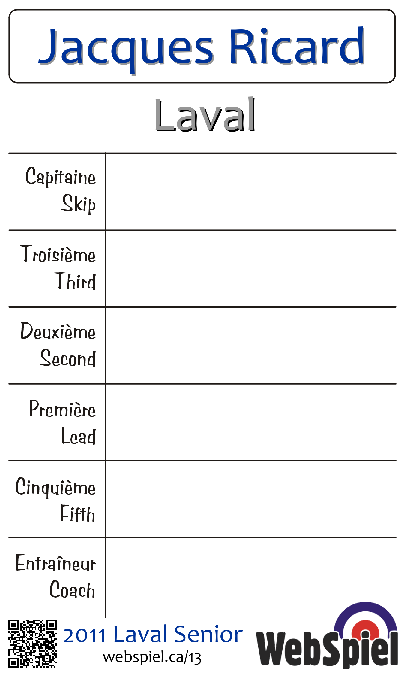 | Club | Laval Club de curling Laval-sur-le-Lac 10 rue les Pins Laval-sur-le-Lac, QC H7R 1C7 CANADA T: 450-627-4791 F: 450-627-7511 http://www.curlinglaval.ca 3 glaces |