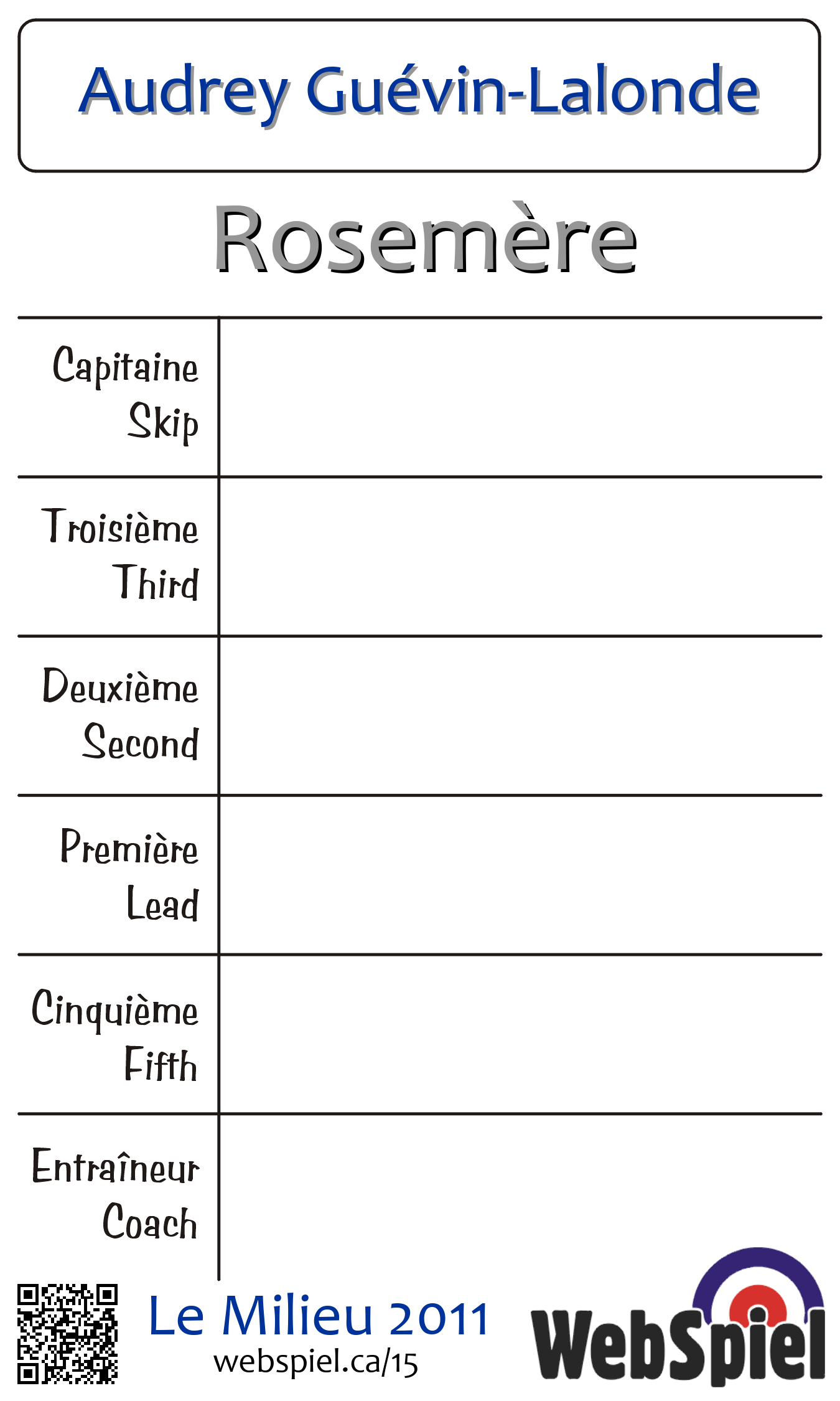 | Club | Rosemère Club de curling Rosemère 224 Grande Côte Rosemère, QC J7A 1H4 CANADA T: 450-437-1374 http://www.curlingrosemere.com/ 3 glaces |
