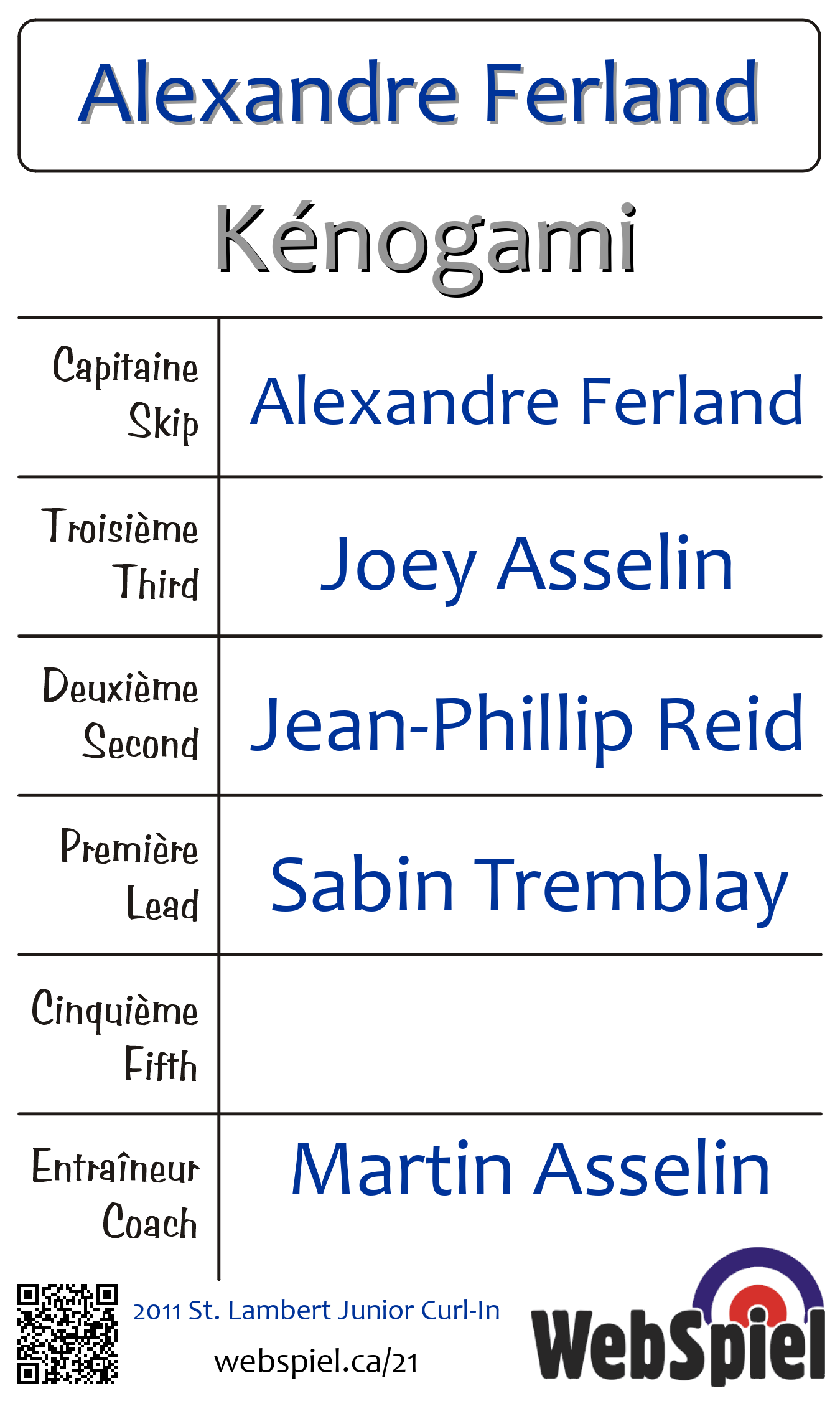 Samedi le 15 octobre 2011, à 20h00 EDT Club de curling St-Lambert, Glace 51 | |||||||||