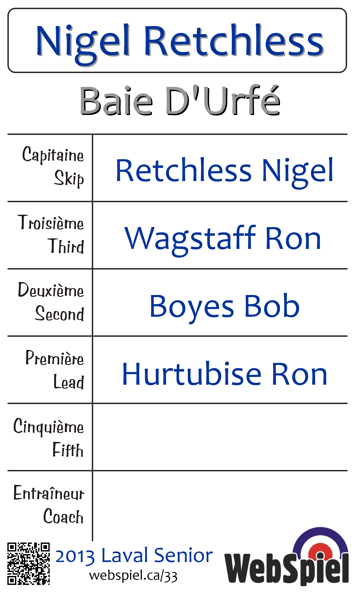 Jeudi le 10 janvier 2013, à 19h00 EST Club de curling Laval-sur-le-Lac, Glace 301, Gagnant › C07, Perdant › Éliminé | |||||||||