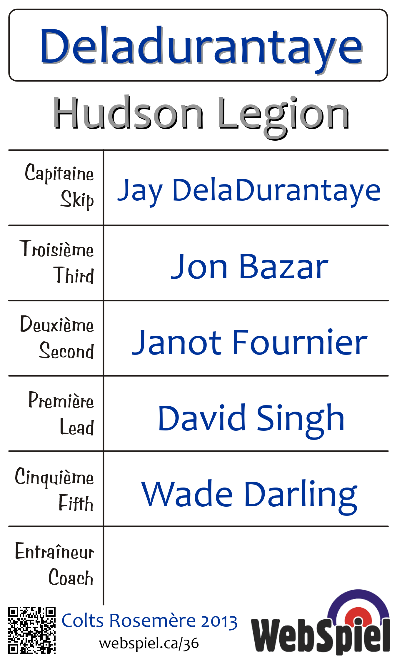 Samedi le 19 janvier 2013, à 22h15 EST Club de curling Rosemère, Glace 141, Gagnant › C04, Perdant › Éliminé | |||||||||